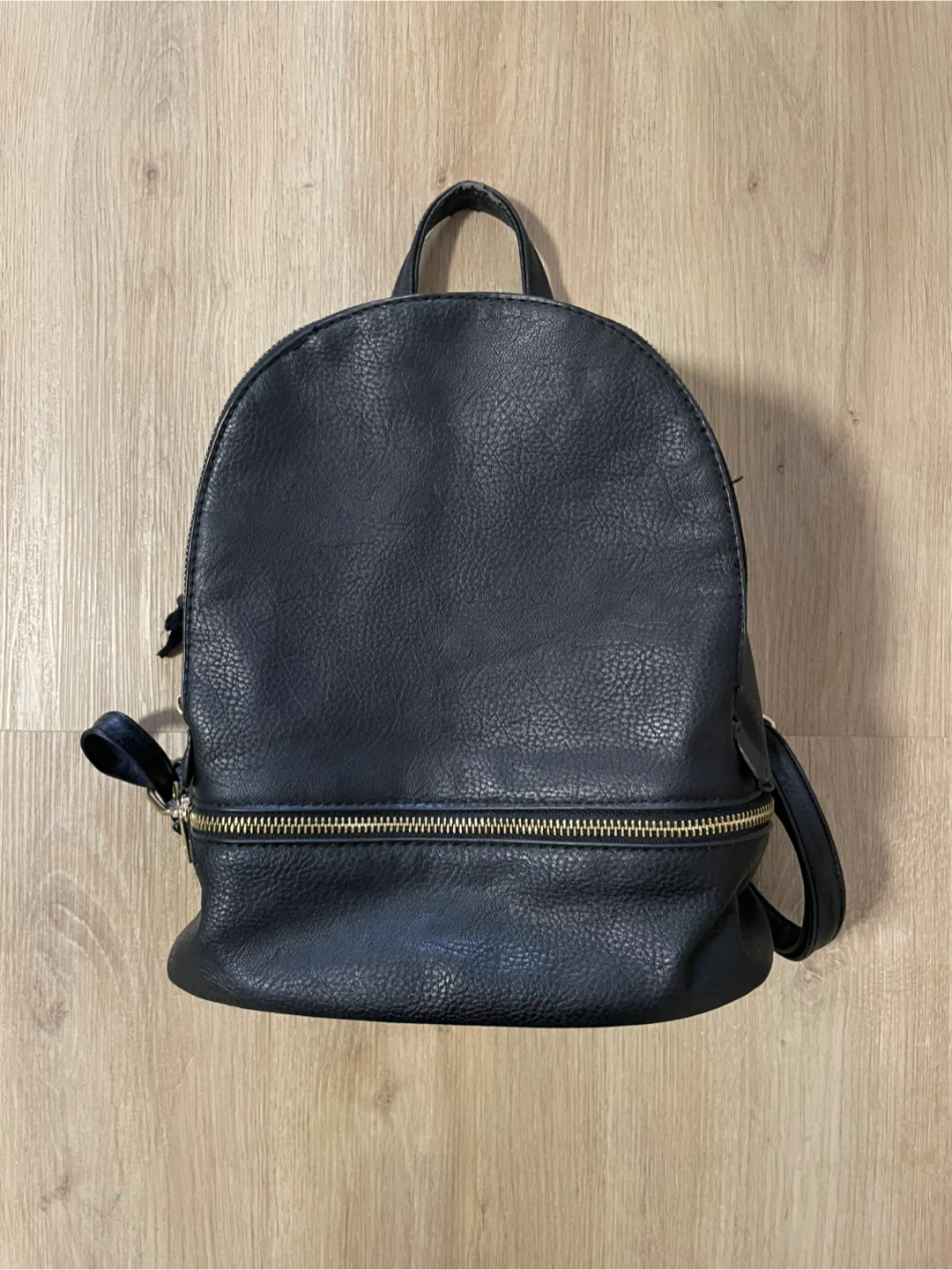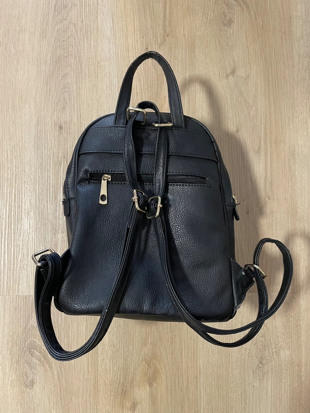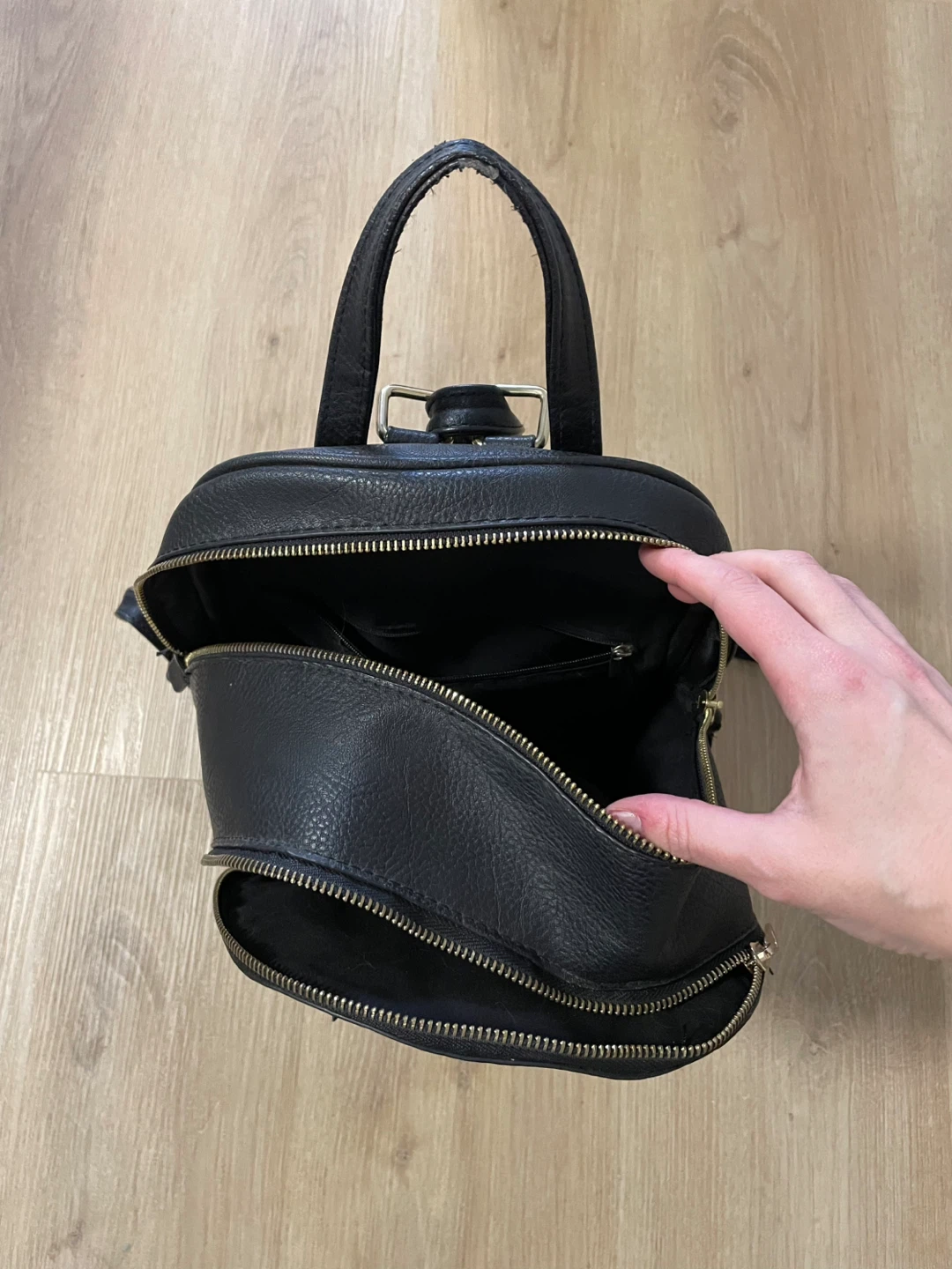 Black leather backpack, mid sized, perfect for work or everyday but wouldn’t fit a laptop.