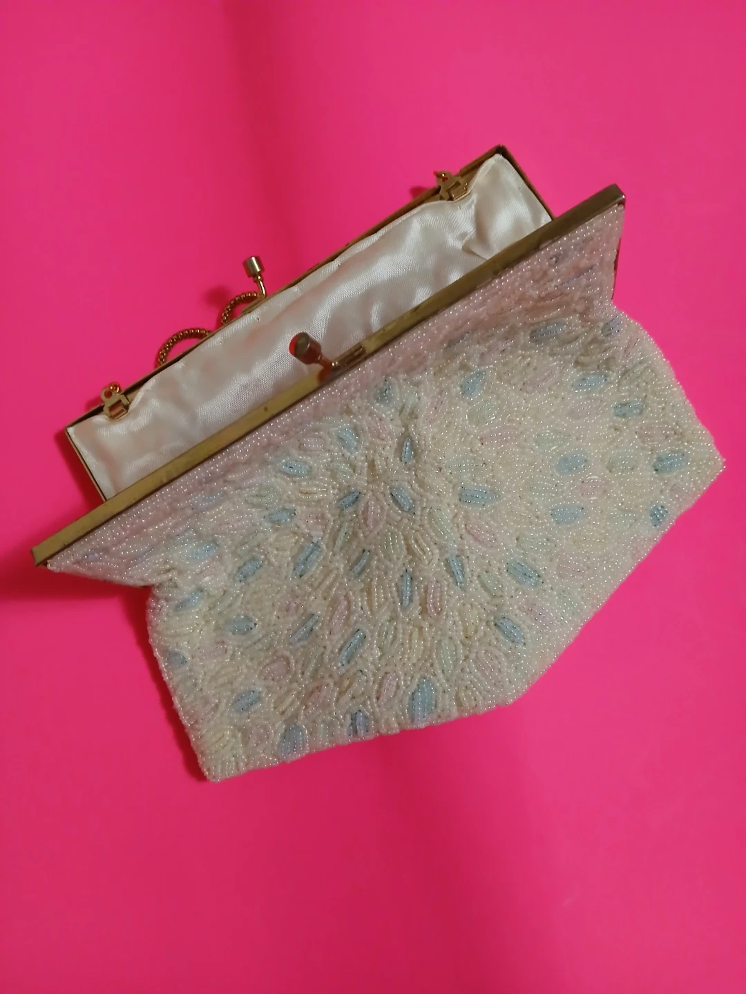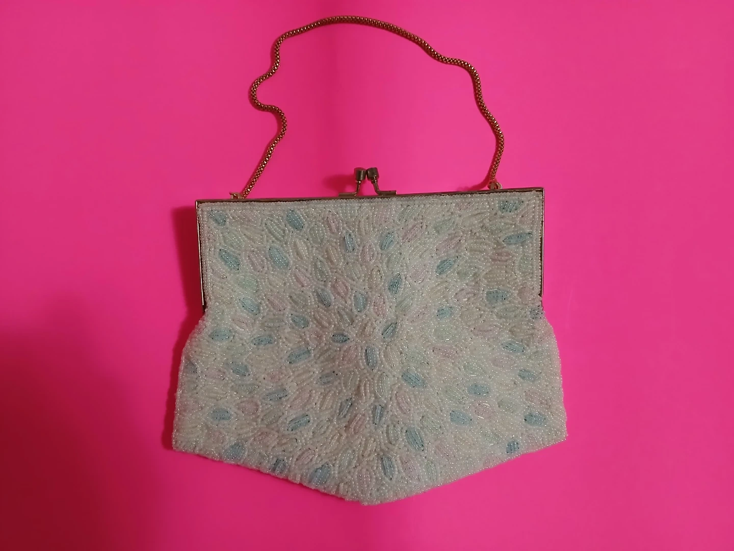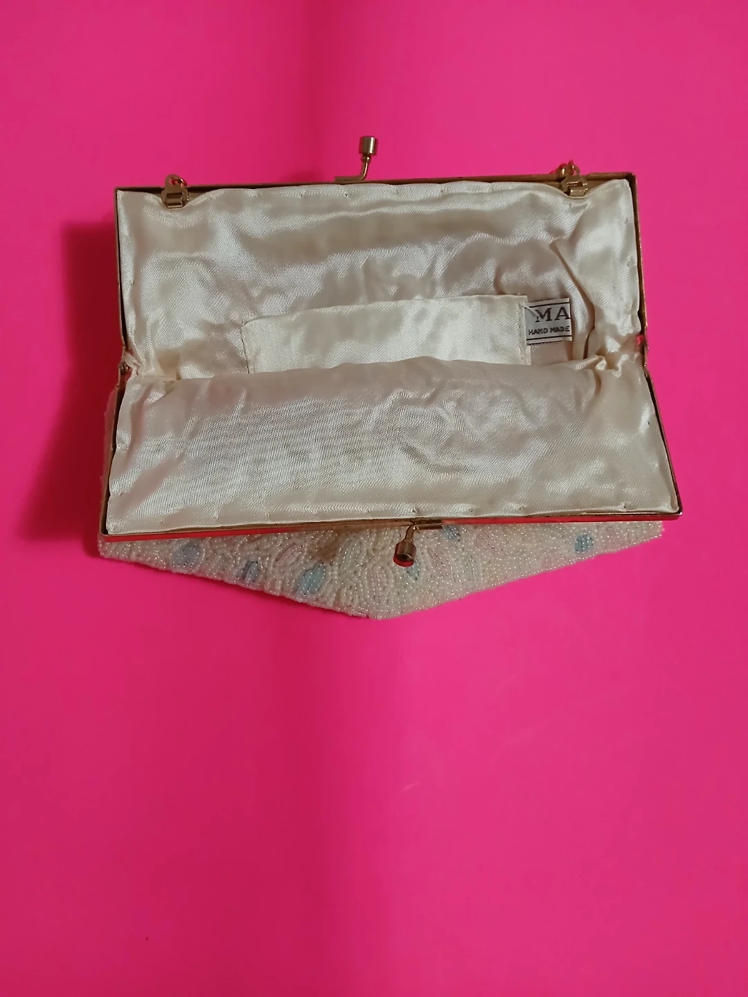 Selling a vintage MA Handbags beaded purse. It's a beautiful piece with delicate beadwork and a gold-tone chain strap. The interior is lined with a satin-like material. Perfect for adding a touch of vintage charm to any outfit!