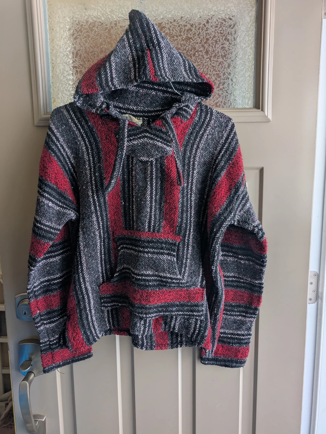 Men's size XL, Oland brand, Mexican Baja hoodie. Red, black and grey coarse woolen jerga fabric. Kangaroo front pocket. Some minor pilling but otherwise good condition