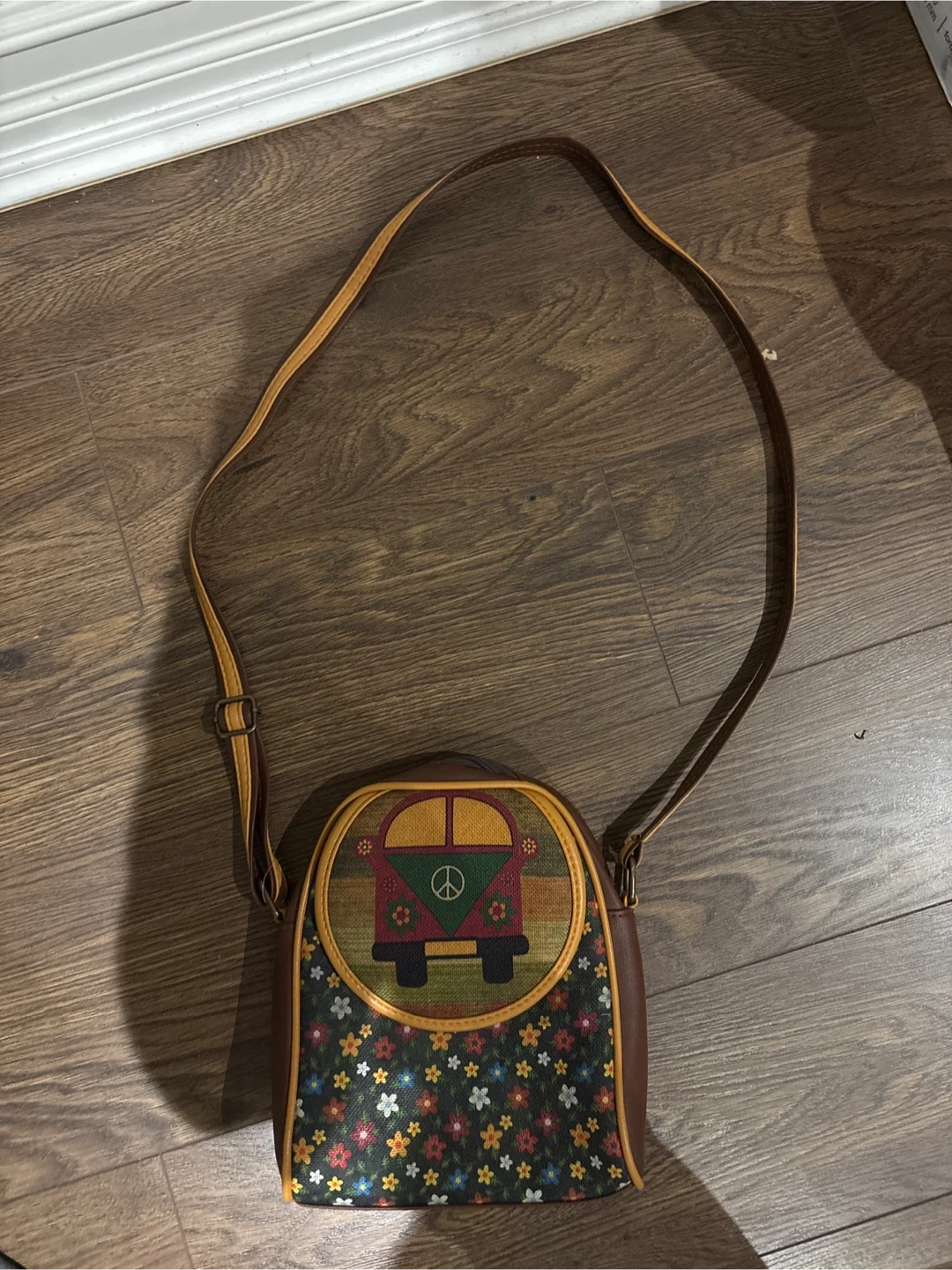 Brand new Super cute crossbody bag featuring a floral pattern and a peace van design! It has a long, adjustable strap and is perfect for carrying your essentials. Great for gifting