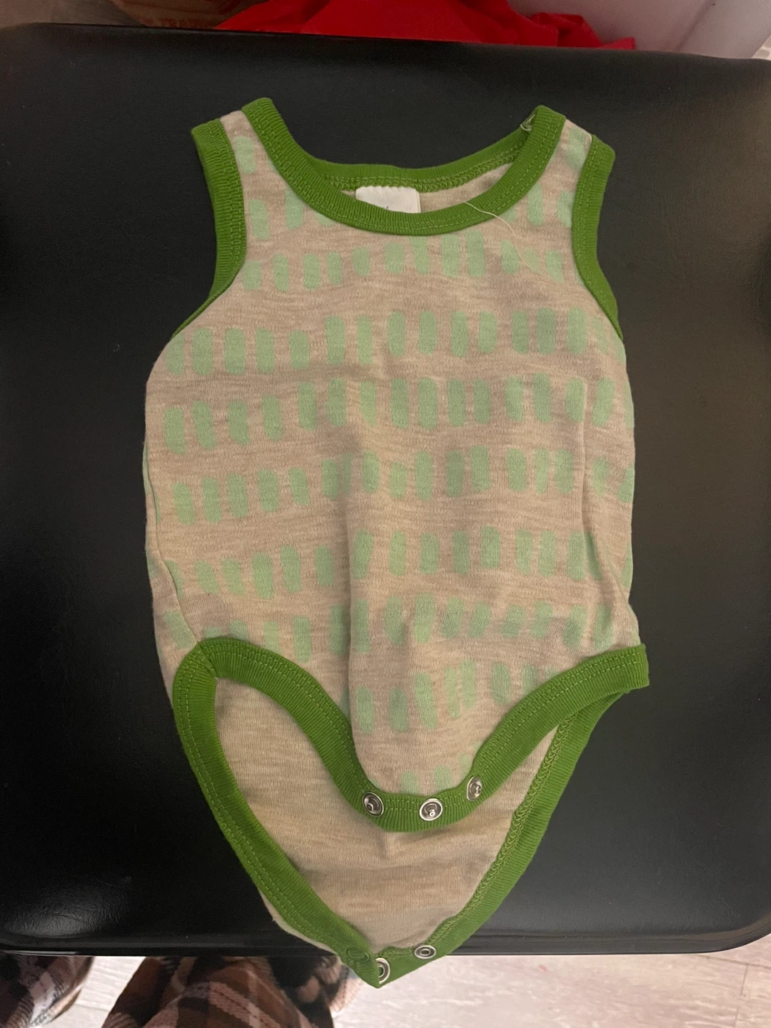 Cute baby bodysuit with a sleeveless design! It features a light beige color with a green trim and a pattern of light green shapes. Perfect for keeping your little one comfy!