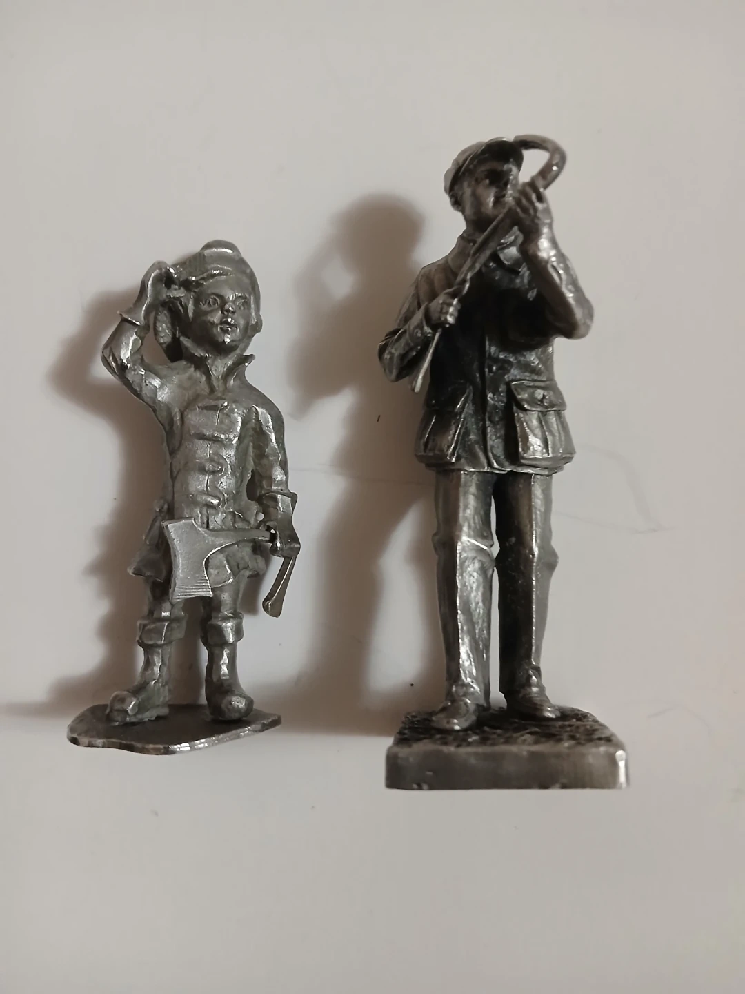 Two vintage metal figurines in good condition. One appears to be holding an axe, and the other a musical instrument. Great for collectors!