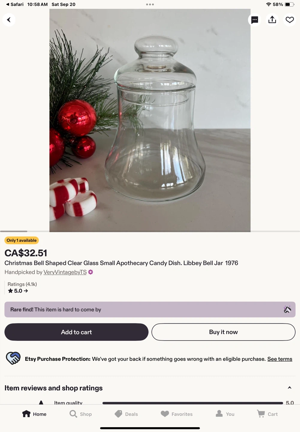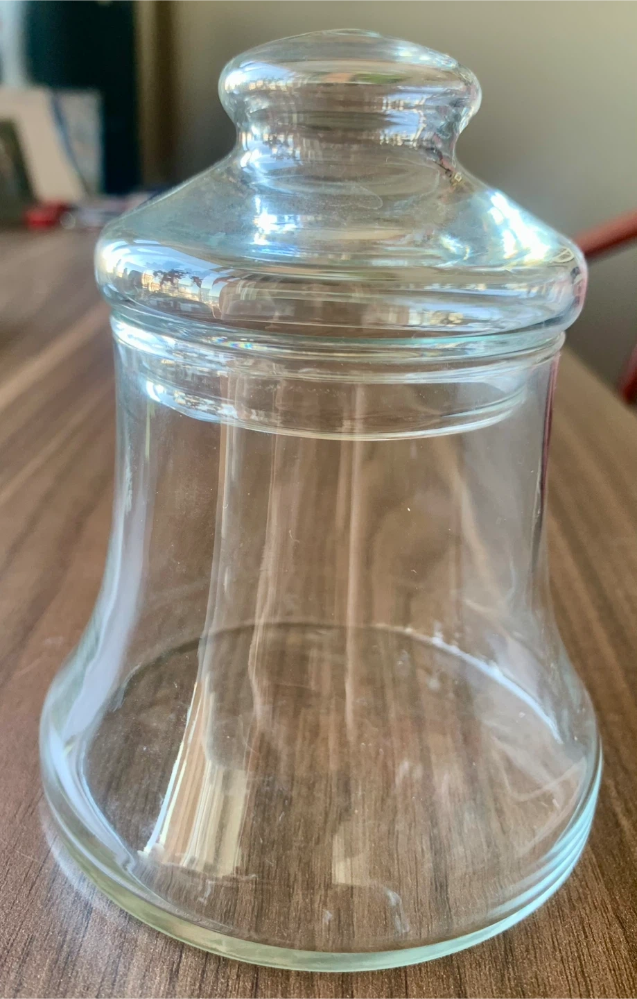 Selling a clear glass apothecary candy dish. It's a Libbey Bell Jar from 1976. It's in great shape and would be perfect for storing candies or other small items, 4” wide at bottom and 6.5” tall.