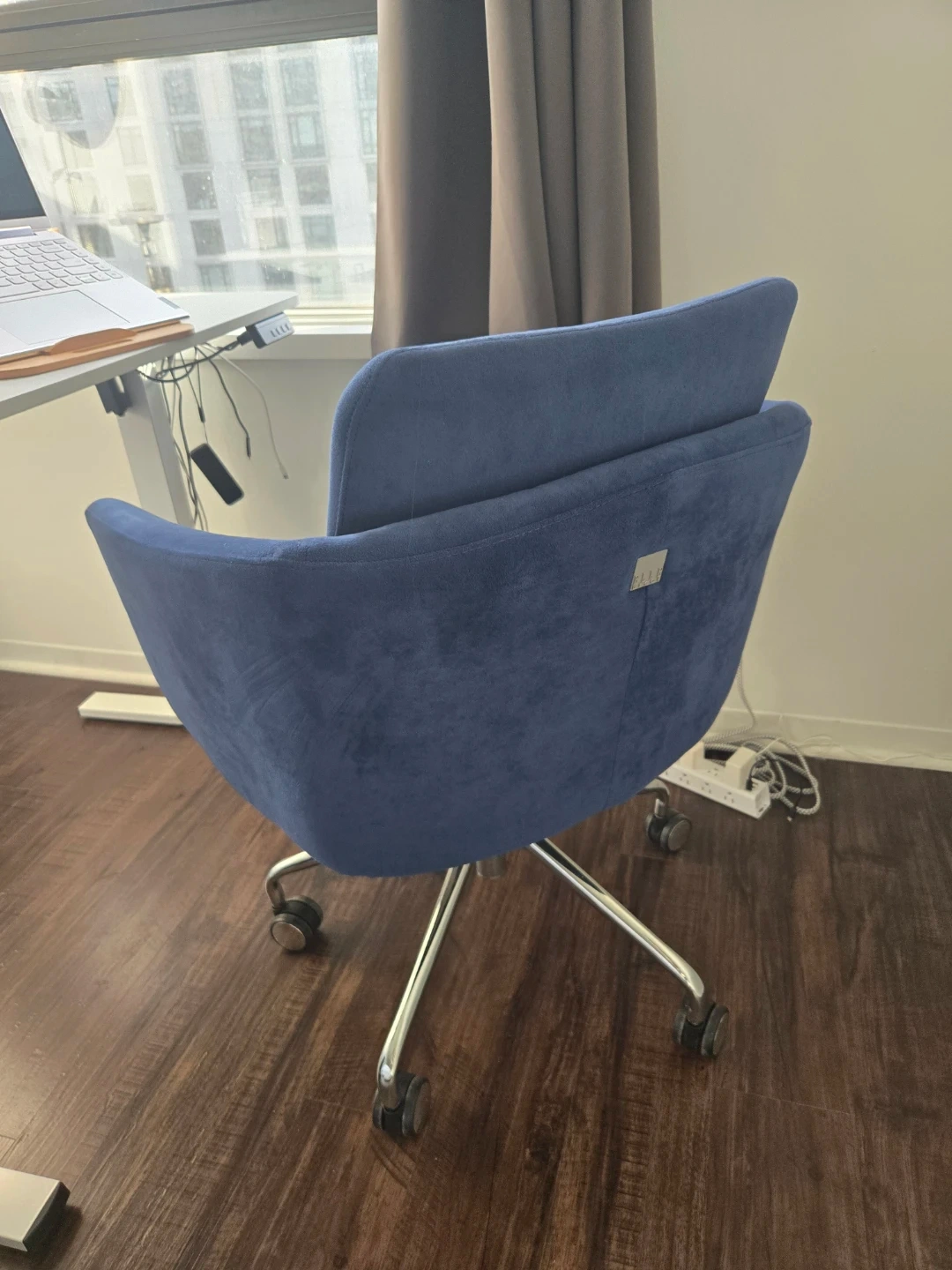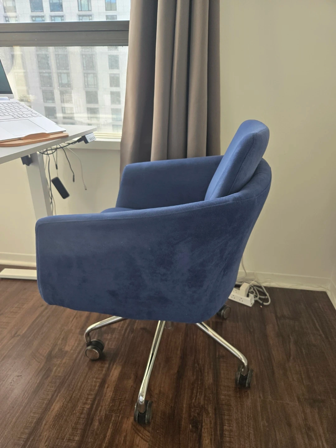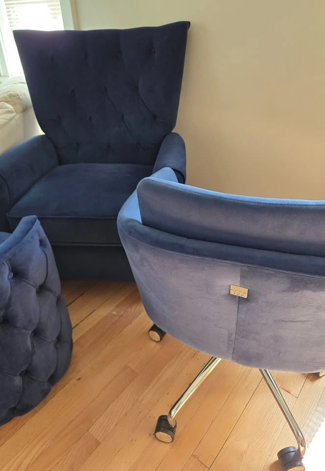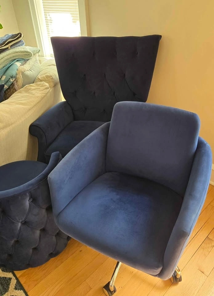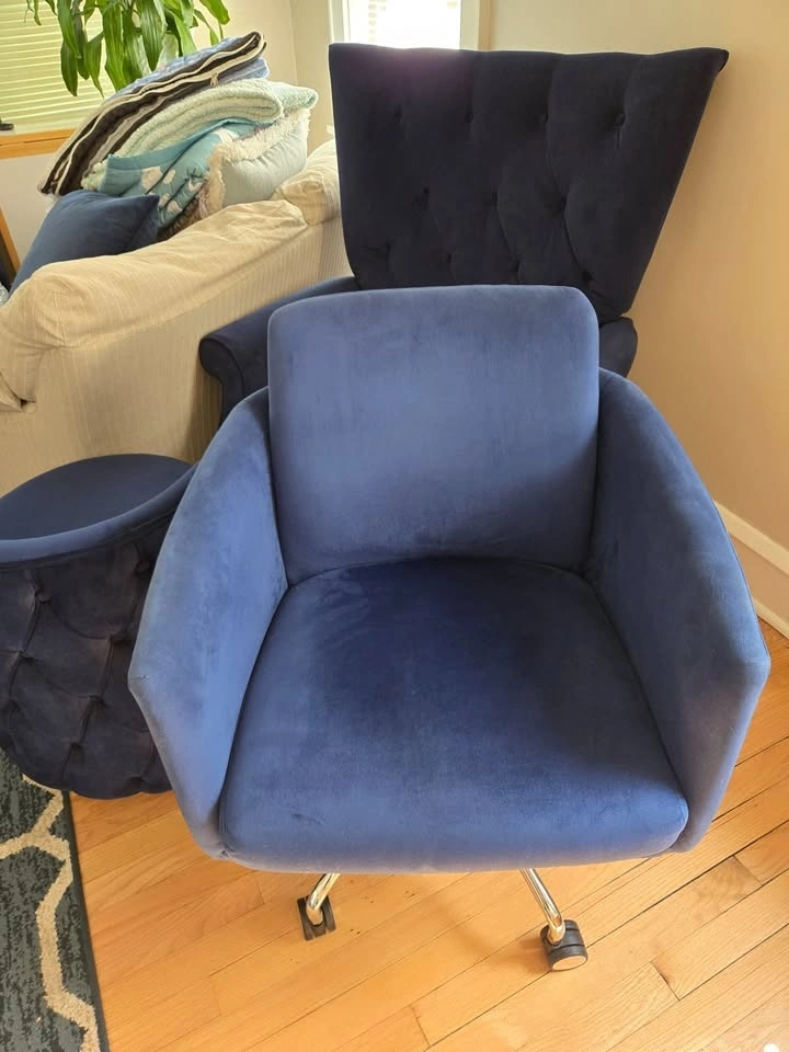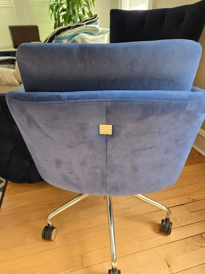 Blue velvet office desk chair, no flaws, from a pet-free home, on wheels, silver accents and hardware.