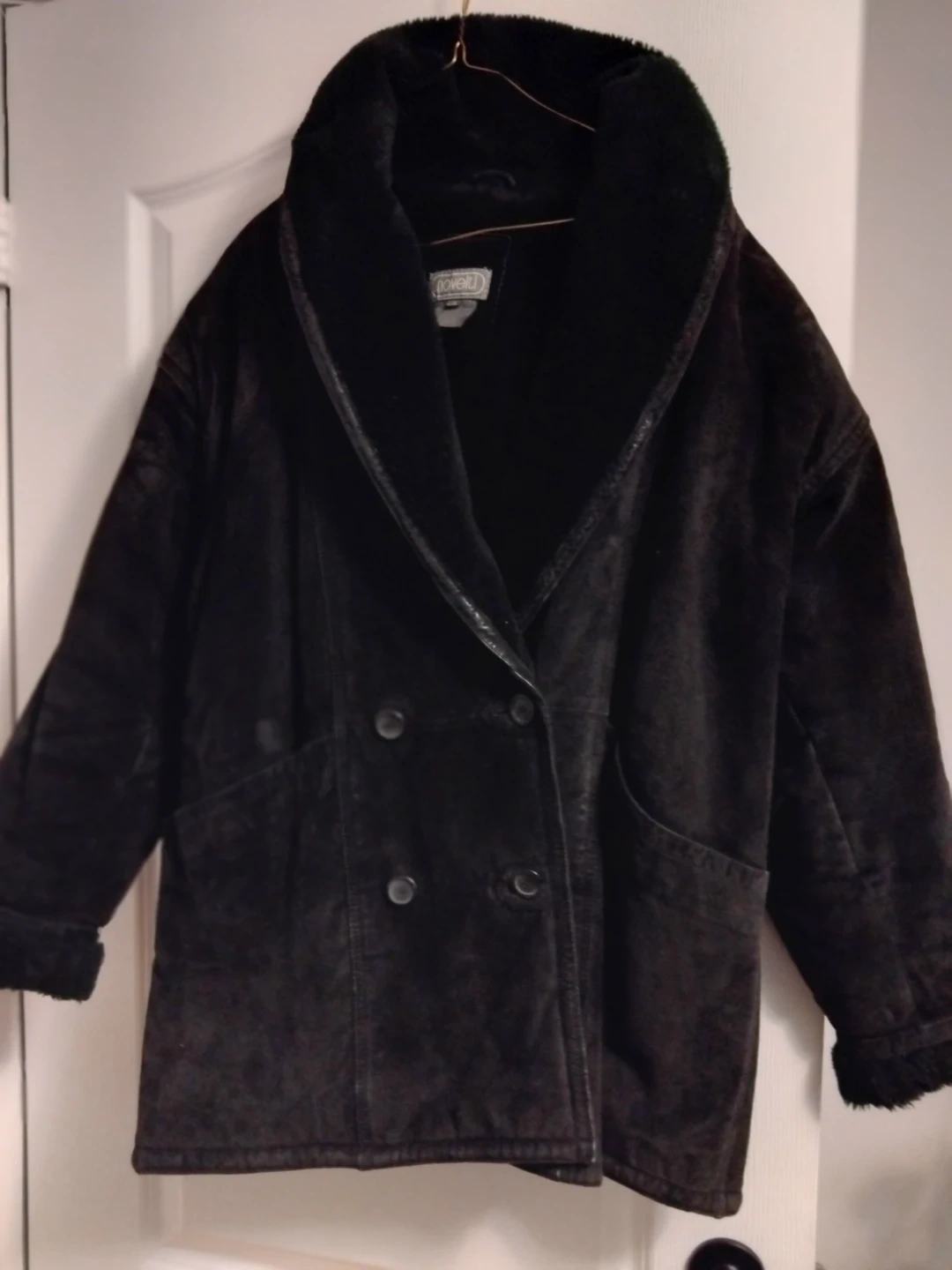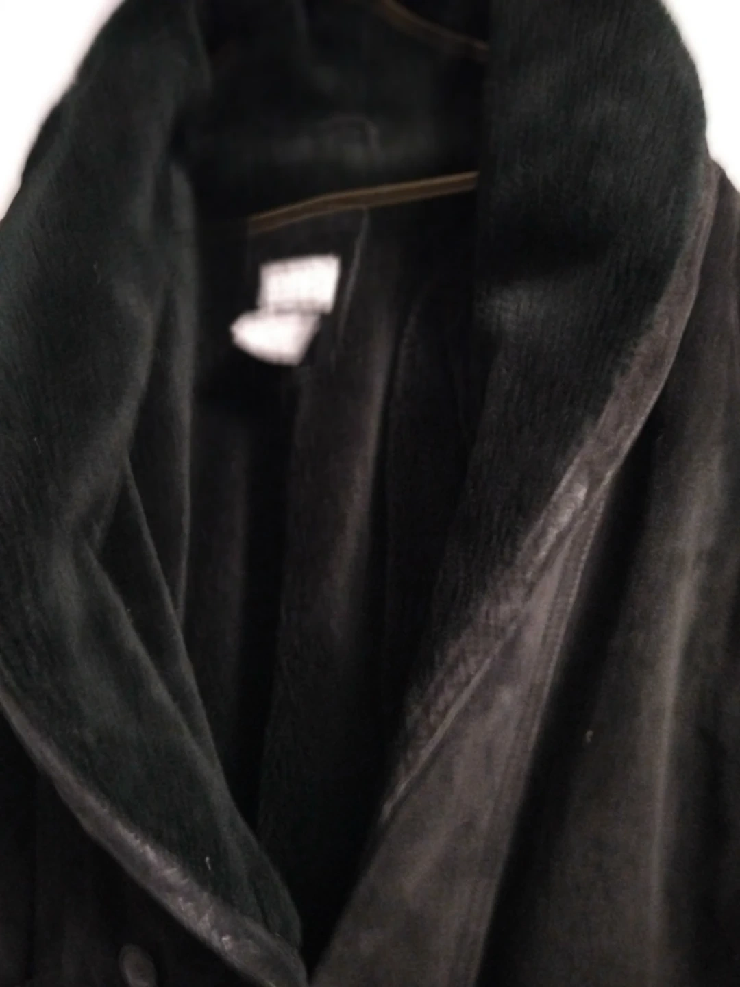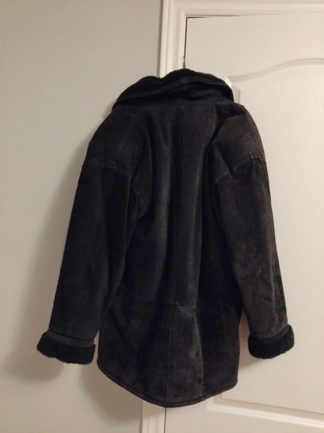 Selling a vintage suede leather coat in black. It is in good condition and has a fur collar. Perfect for the colder weather!