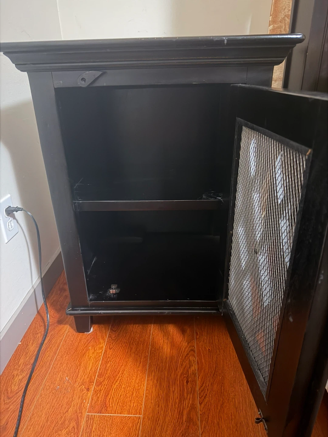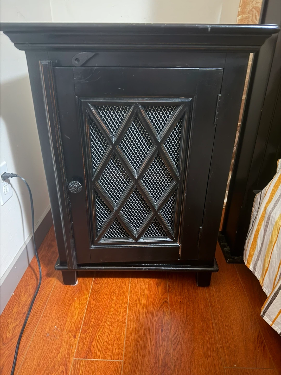 Selling a solid dark walnut/brown wood nightstand. It has a door with a mesh front and an interior shelf for storage. Perfect for adding a touch of elegance to your bedroom!