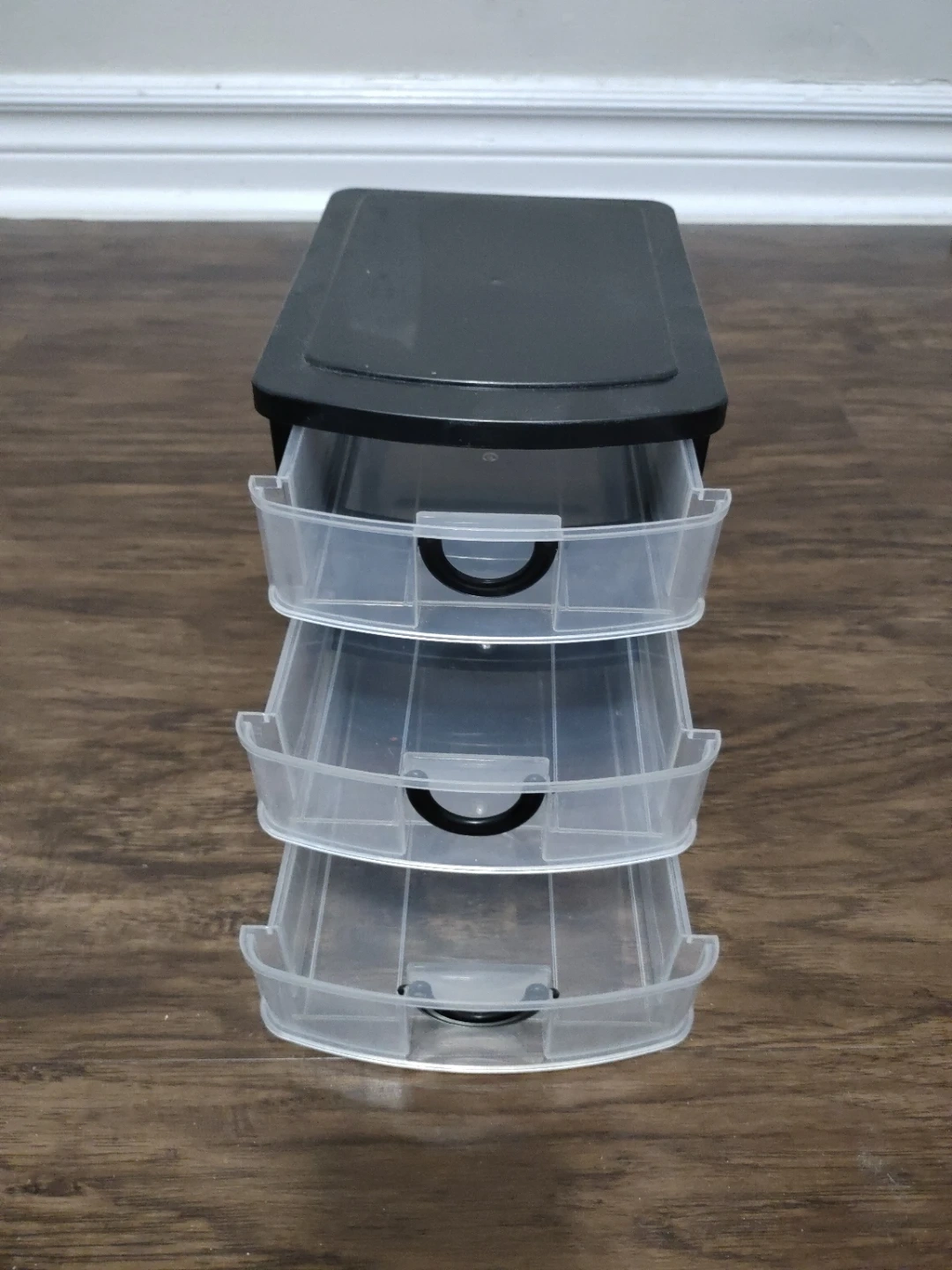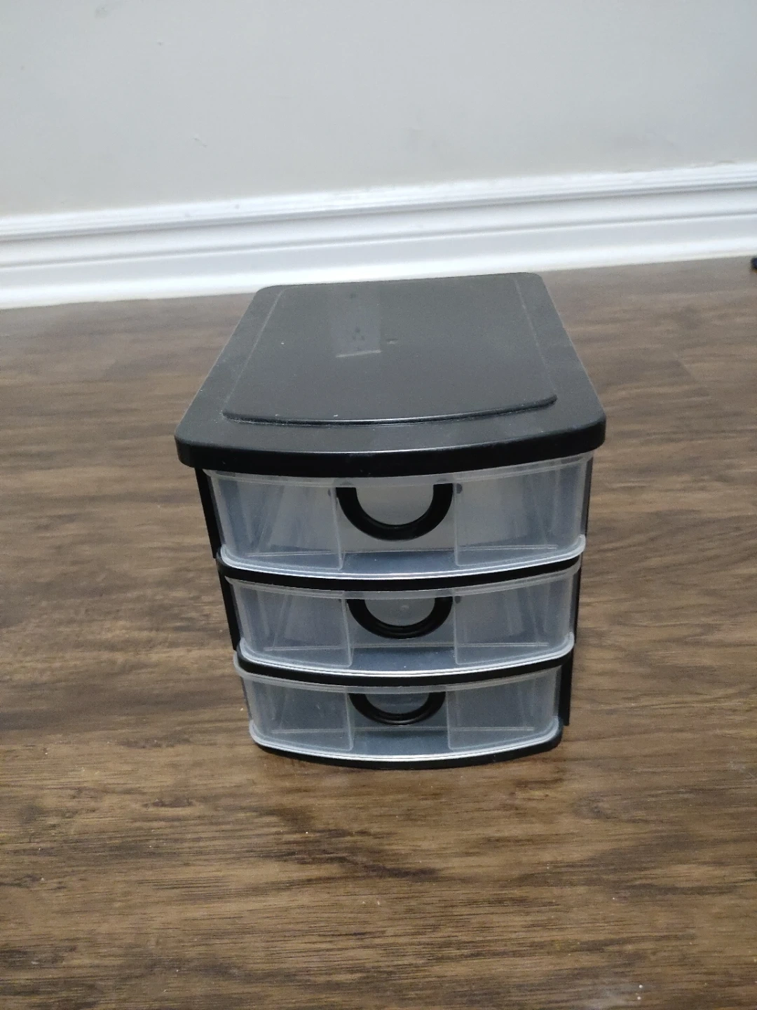 Here's a handy little storage organizer with three drawers! It's perfect for keeping small items tidy on your desk or in a closet (e.g. make-up). The drawers are clear, so you can easily see what's inside, and the black top gives it a sleek look.