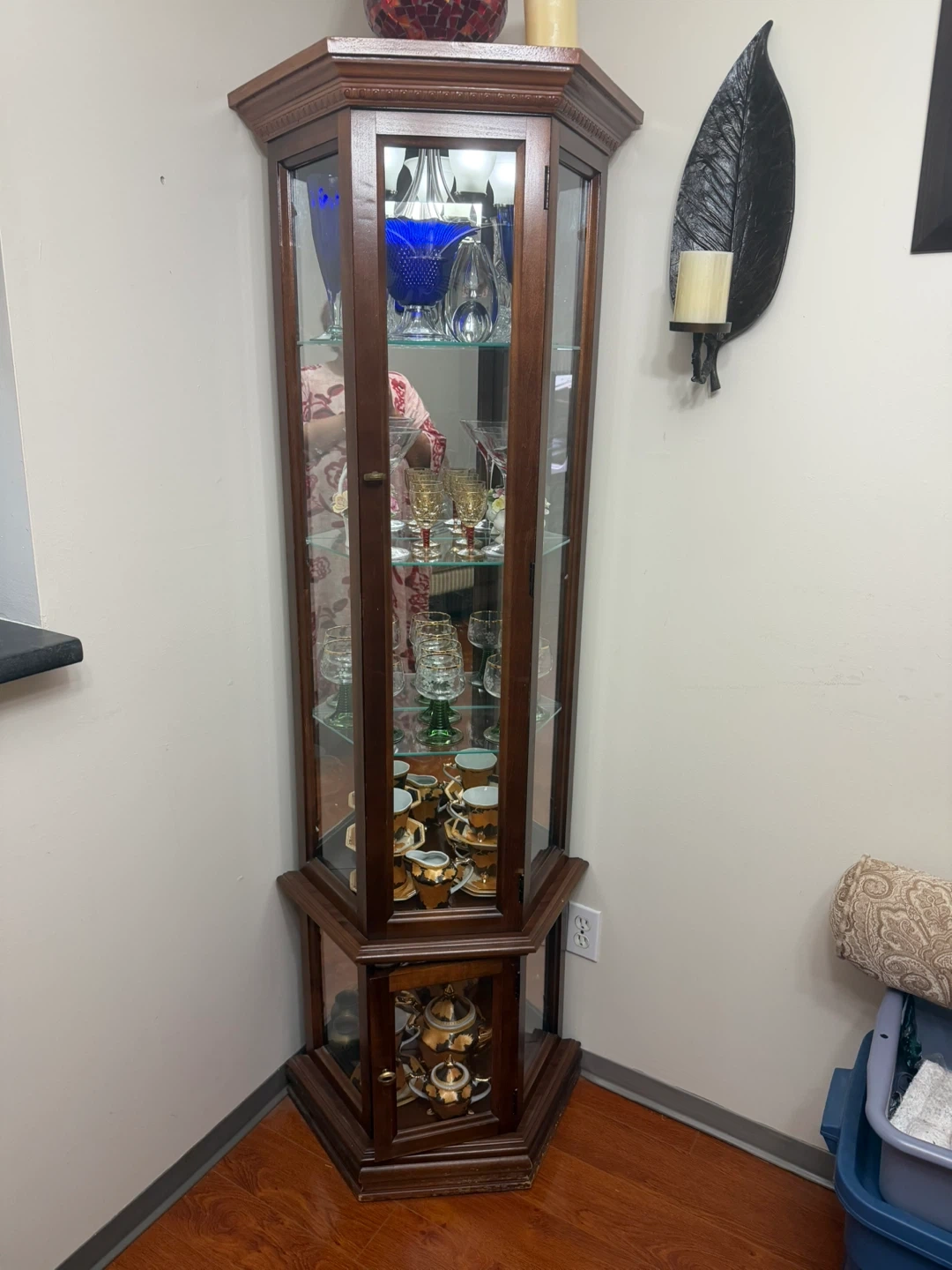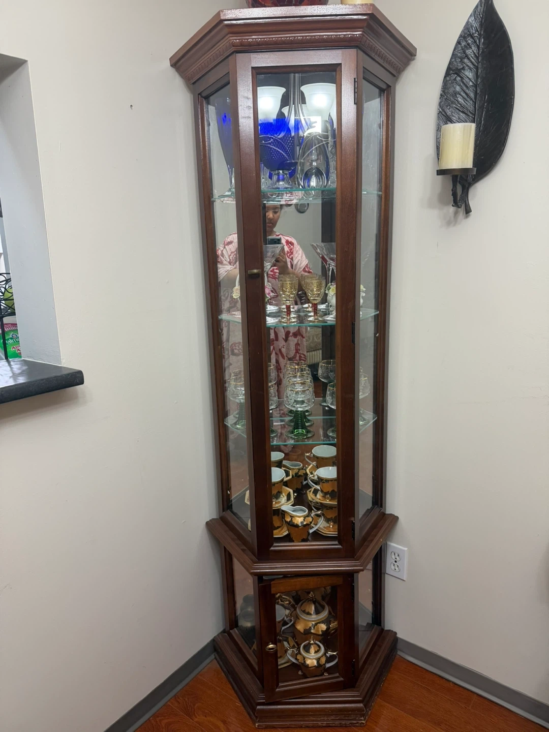 Selling a corner curio cabinet. It's perfect for displaying your favourite items! It has glass shelves and a wooden frame.
