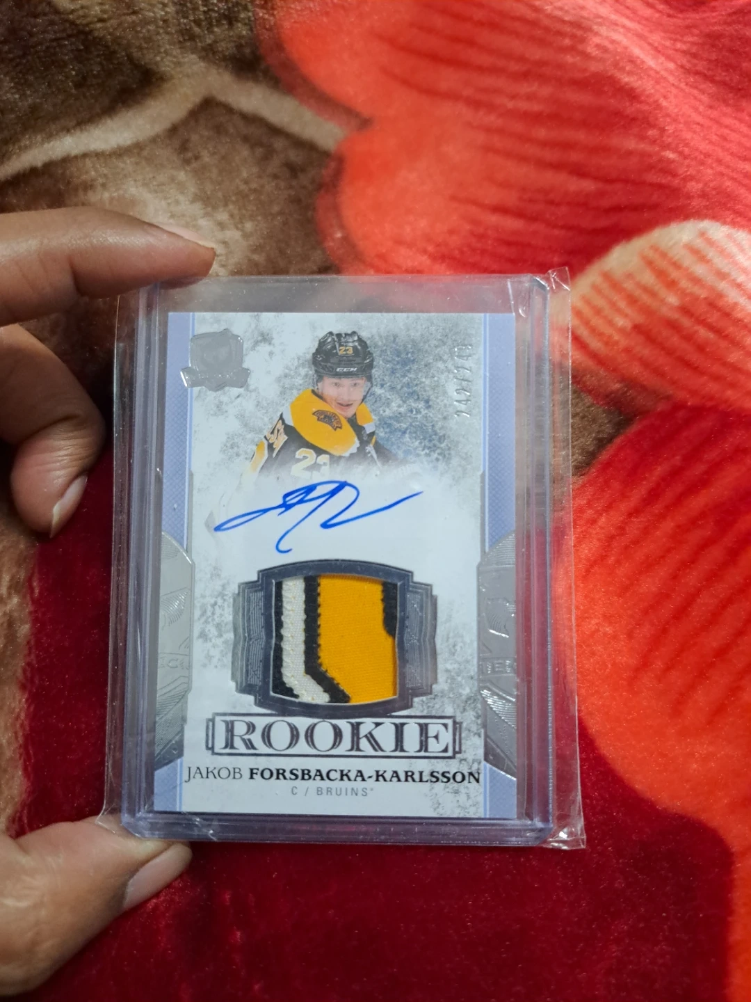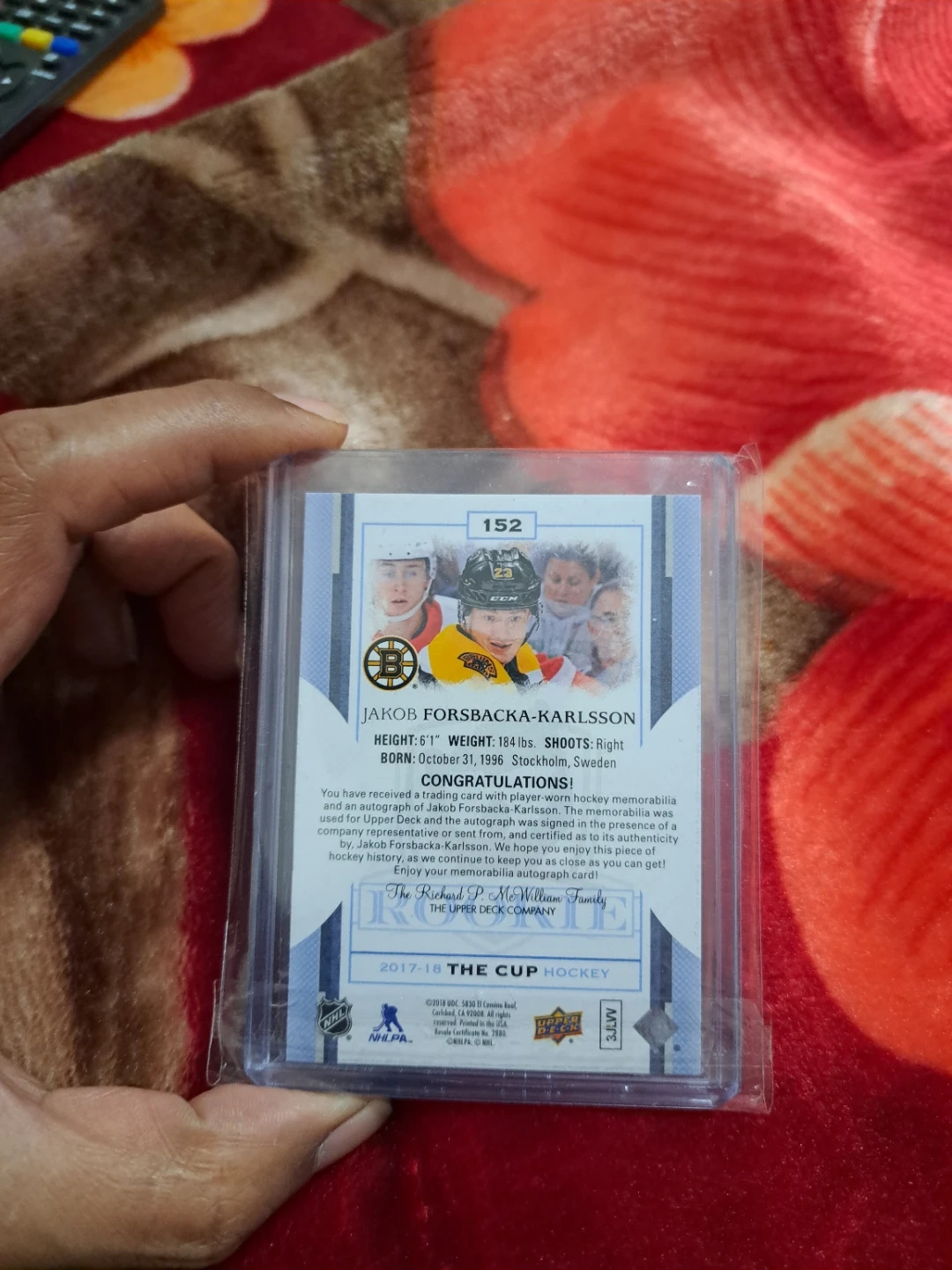 Selling a Jakob Forsbacka-Karlsson rookie hockey card from the 2017-18 The Cup Hockey series. The card features a patch and autograph. He is 6'1" and weighs 184 lbs. Born October 31, 1996 in Stockholm, Sweden