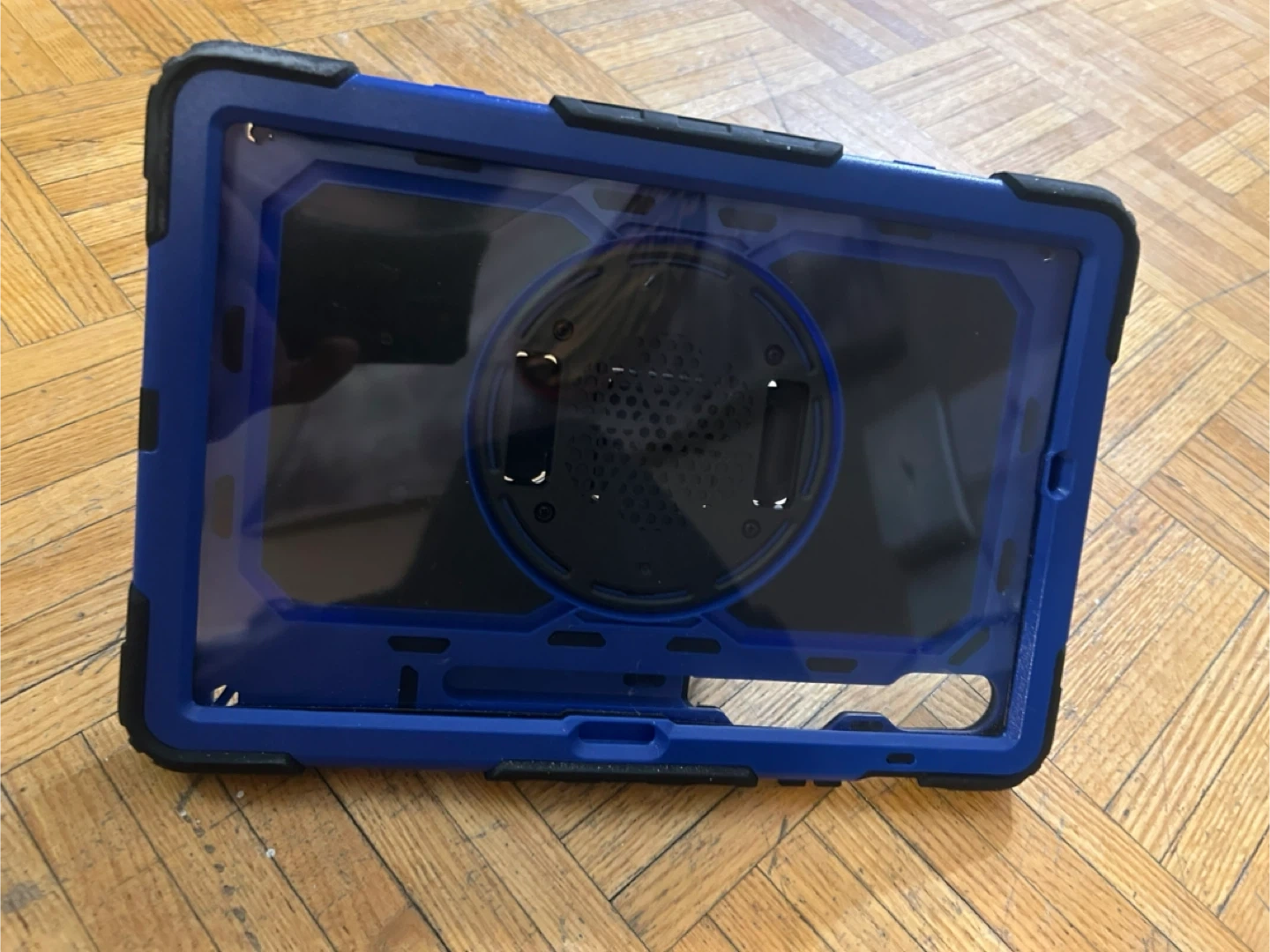 Selling a blue tablet case that's in great condition! It has a rotating hand strap and a stand for easy viewing. It also has a shoulder strap for carrying it around