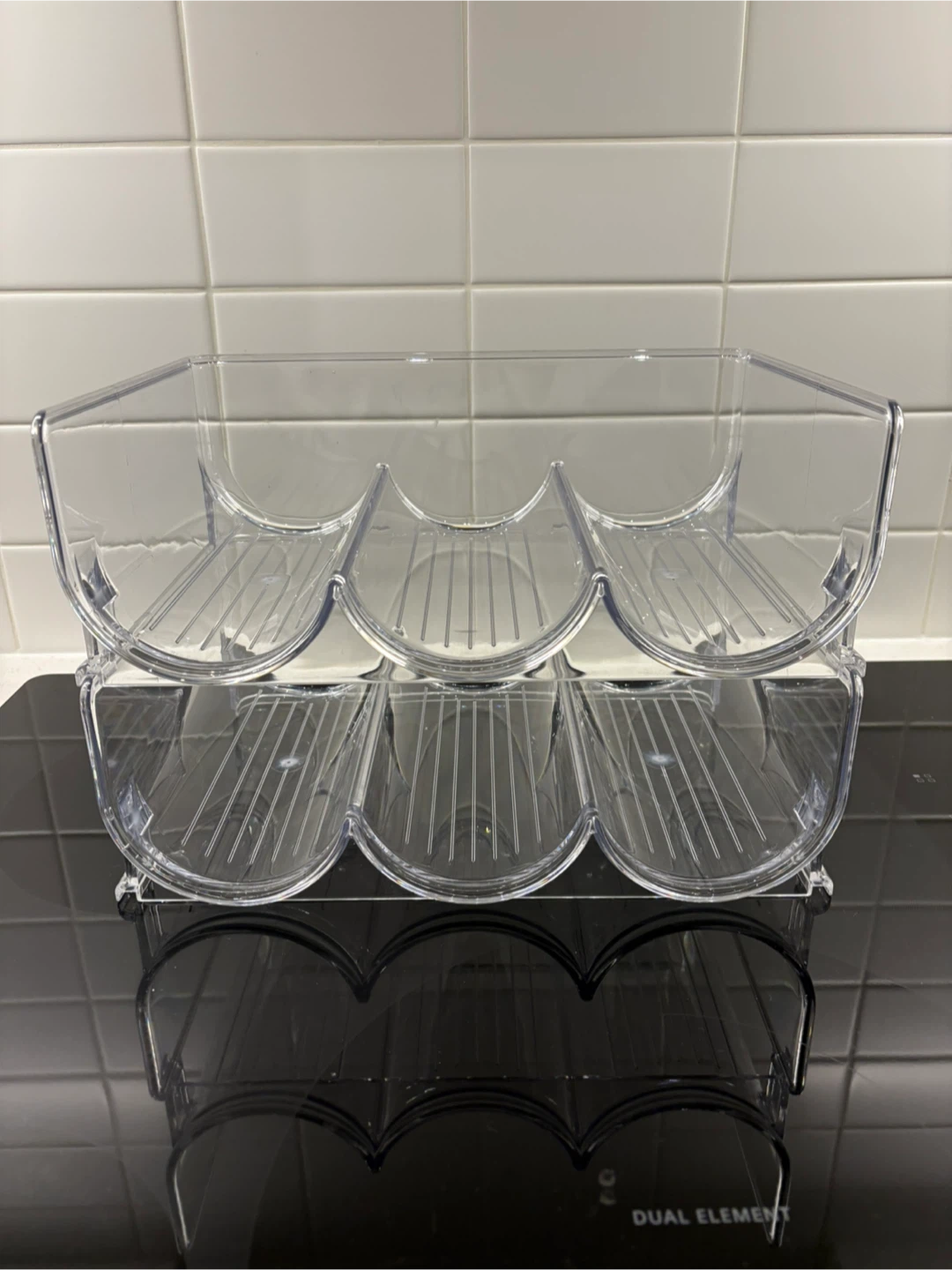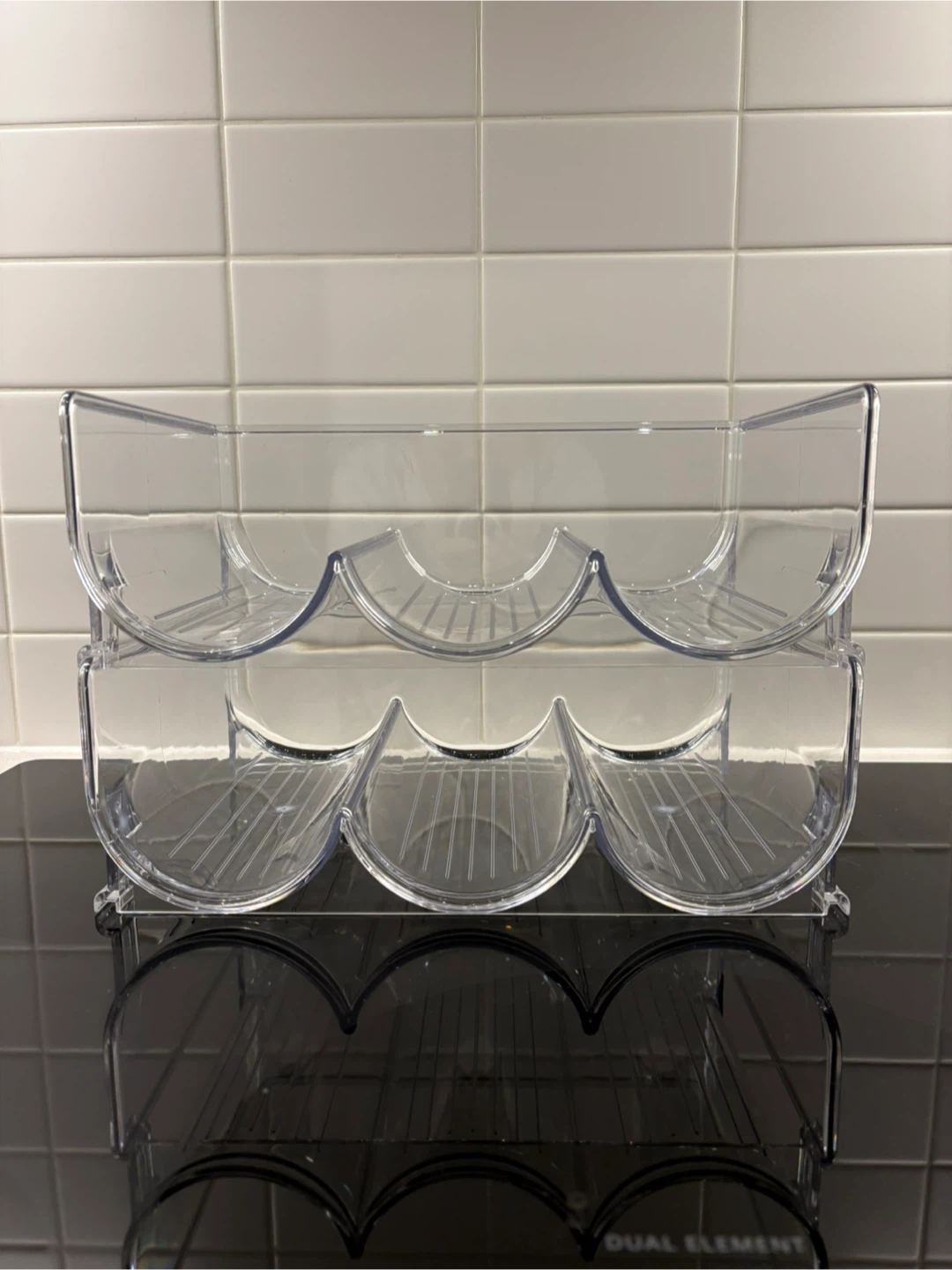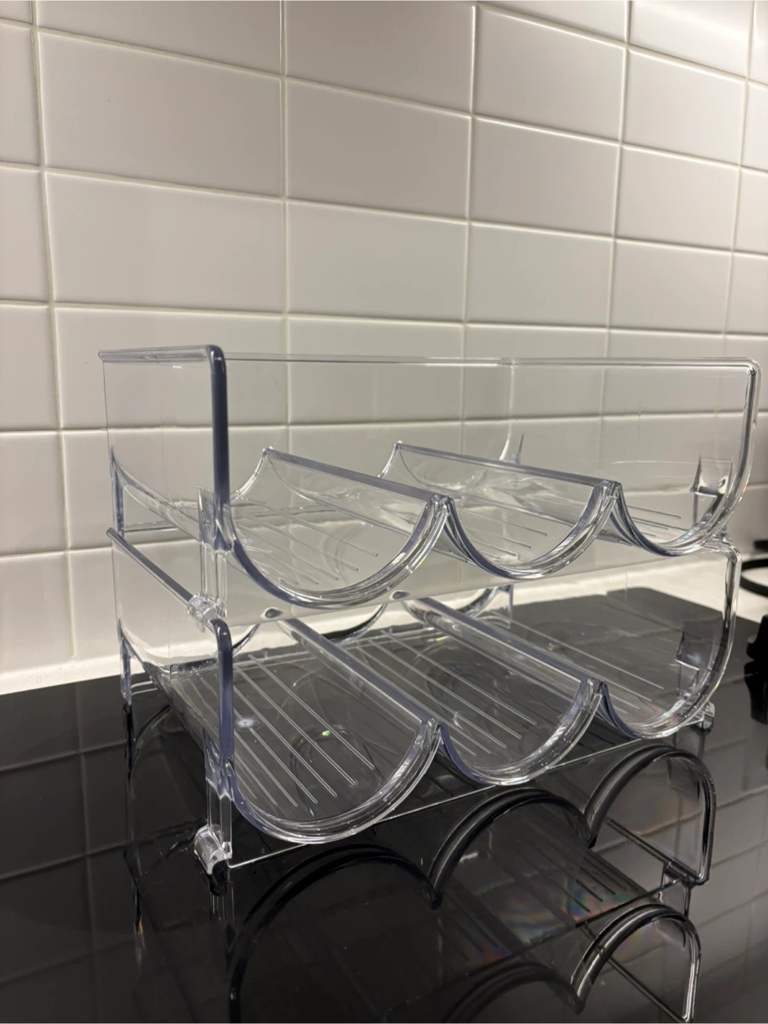 Selling a clear, stackable bottle rack organizer! It's in like new condition and perfect for keeping your water bottles, or any bottles , neatly stored. It can also be used for other bottled beverages. It can be used stacked or separated . It holds 6 bottles in total . Originally paid 33$. Selling for 10$