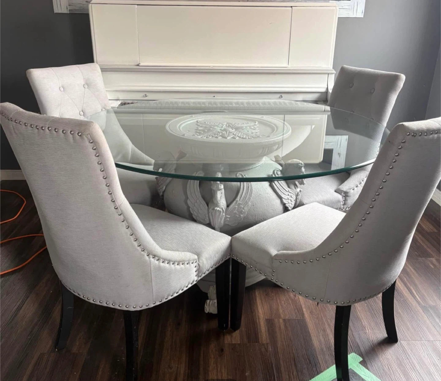 Selling a lovely round glass dining table with four matching chairs. The chairs are upholstered in a light grey fabric with silver nailhead trim. The table has a unique decorative base. It's a stylish set that would look great in any dining room!