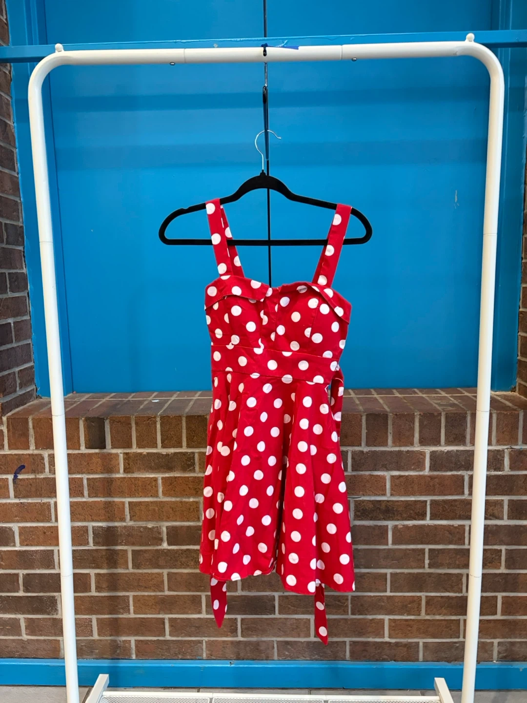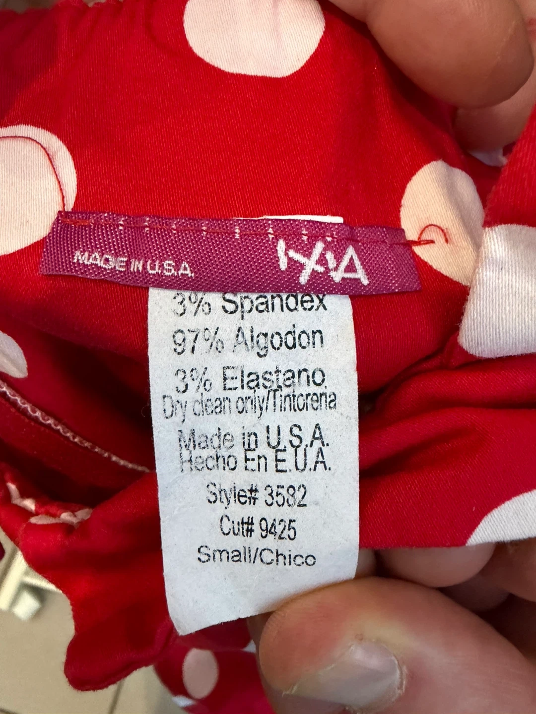 Super cute red dress with white polka dots! It's a size small and made of 97% Algodon and 3% Spandex. Perfect for a fun and flirty look!