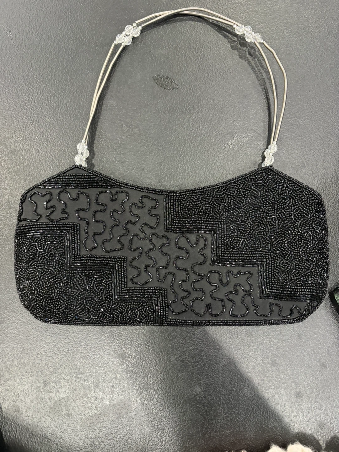 This is a stylish black beaded evening bag. It's perfect for a night out or a special occasion. The bag has a unique beaded design and a comfortable handle. It's in great condition and ready to add a touch of elegance to your outfit