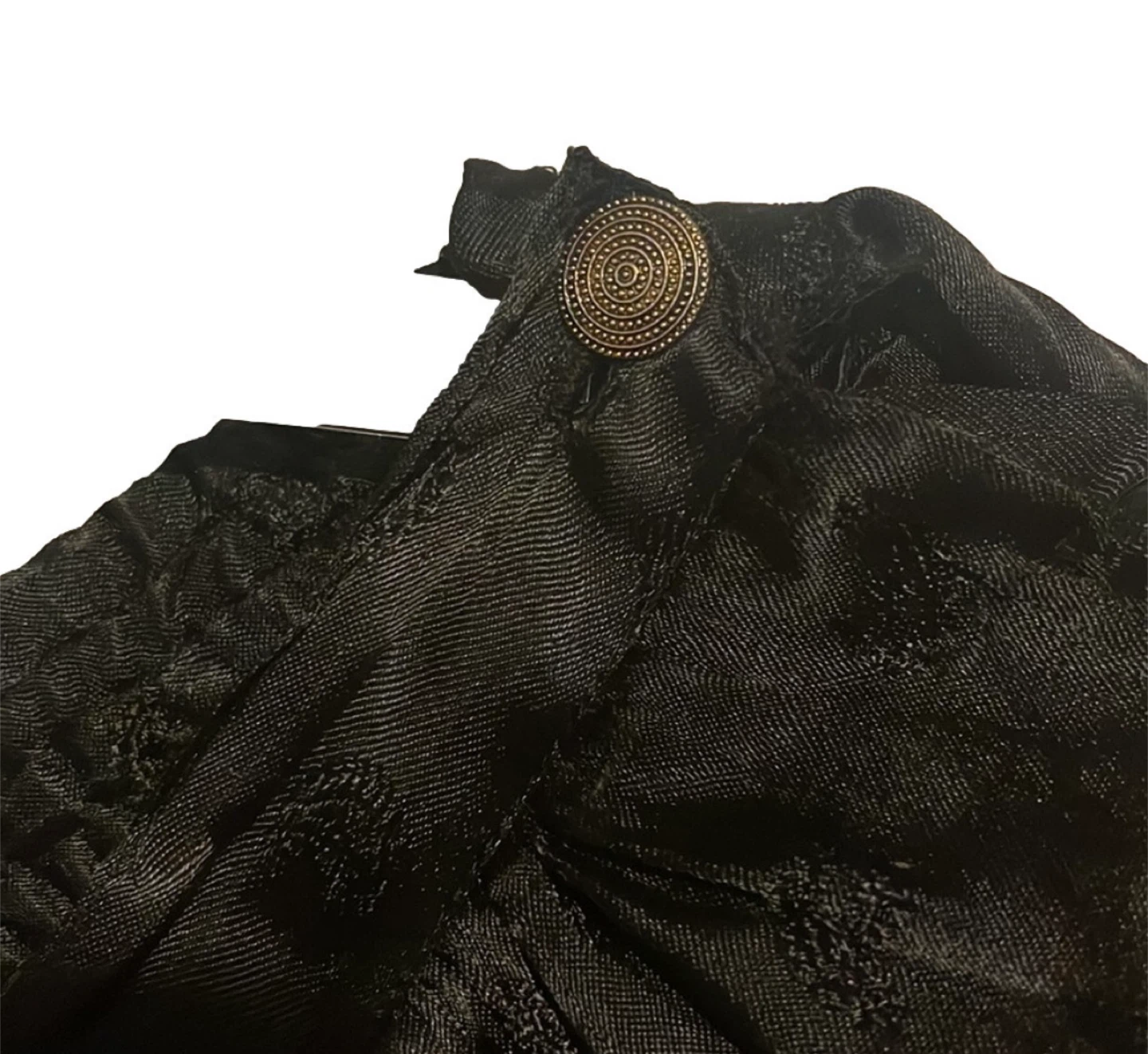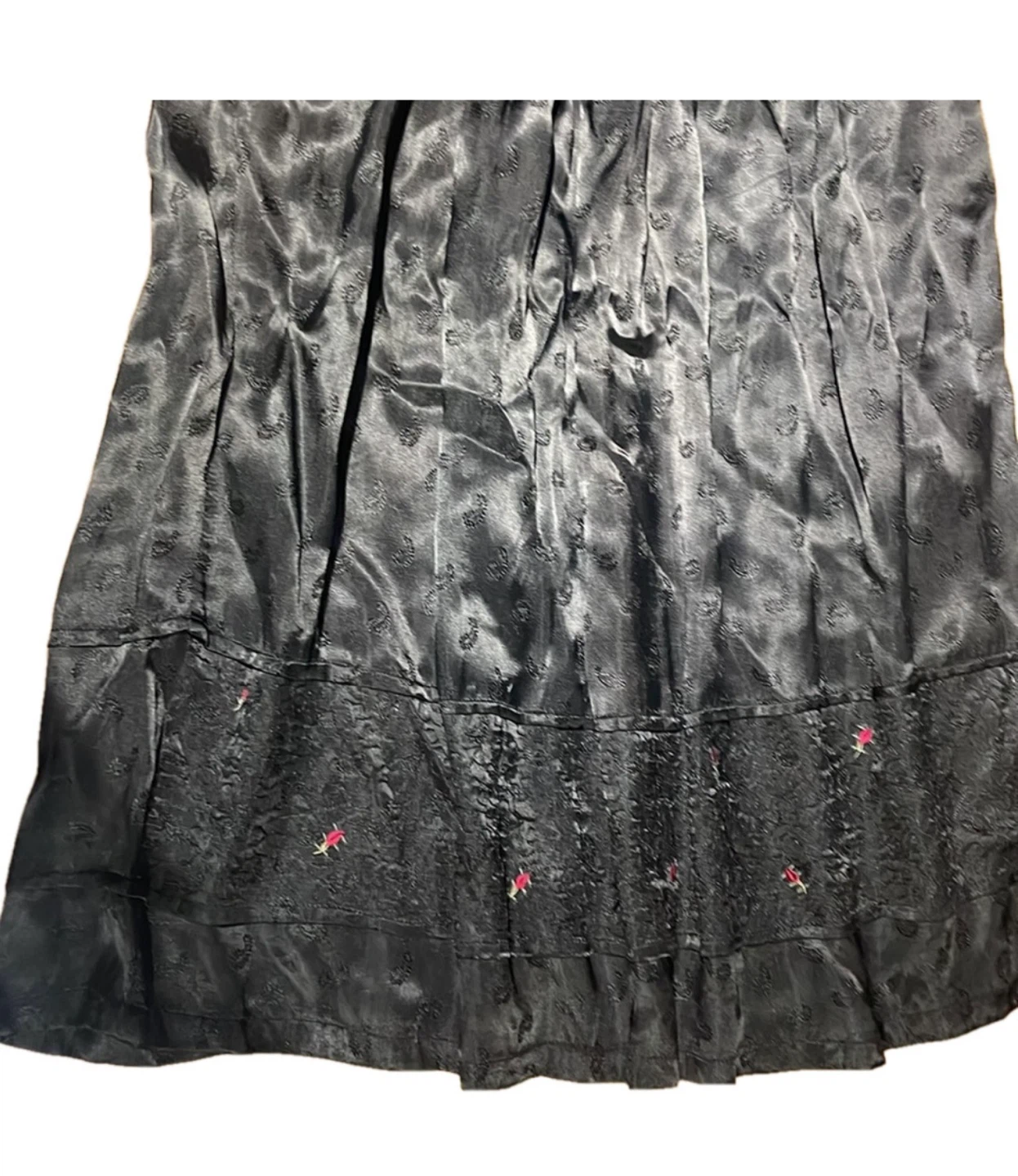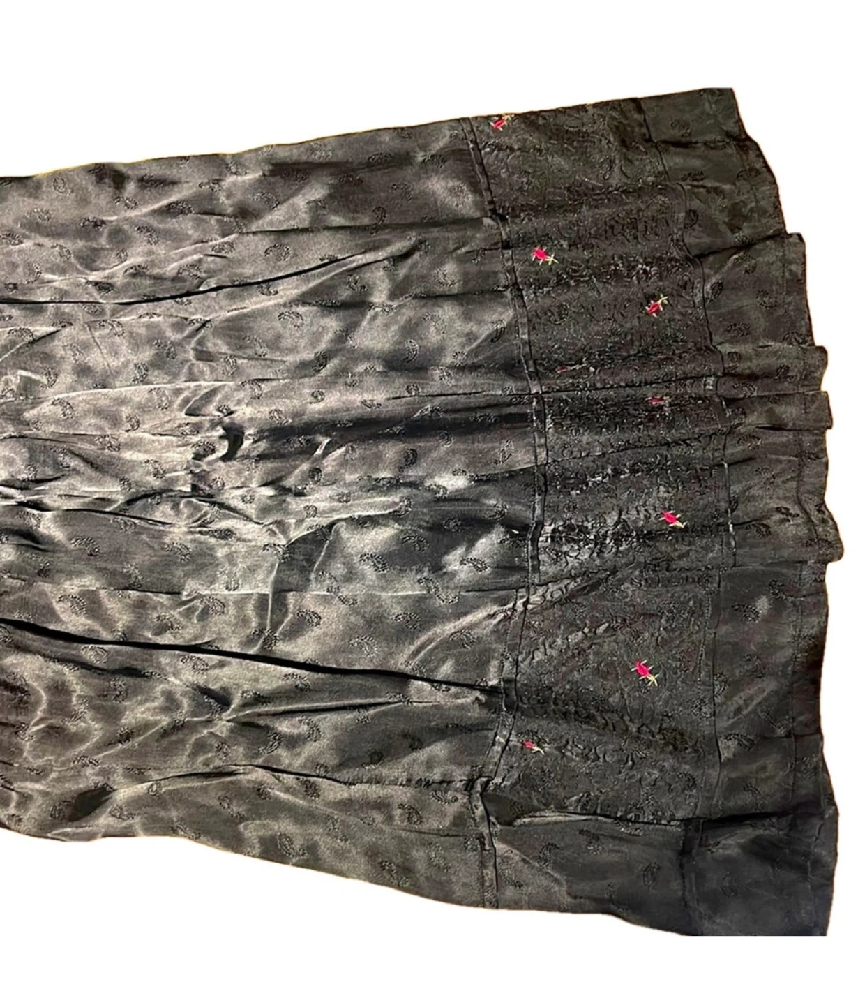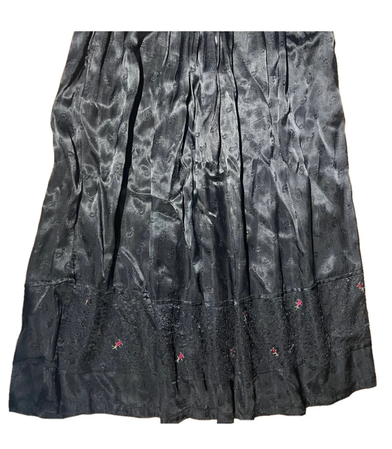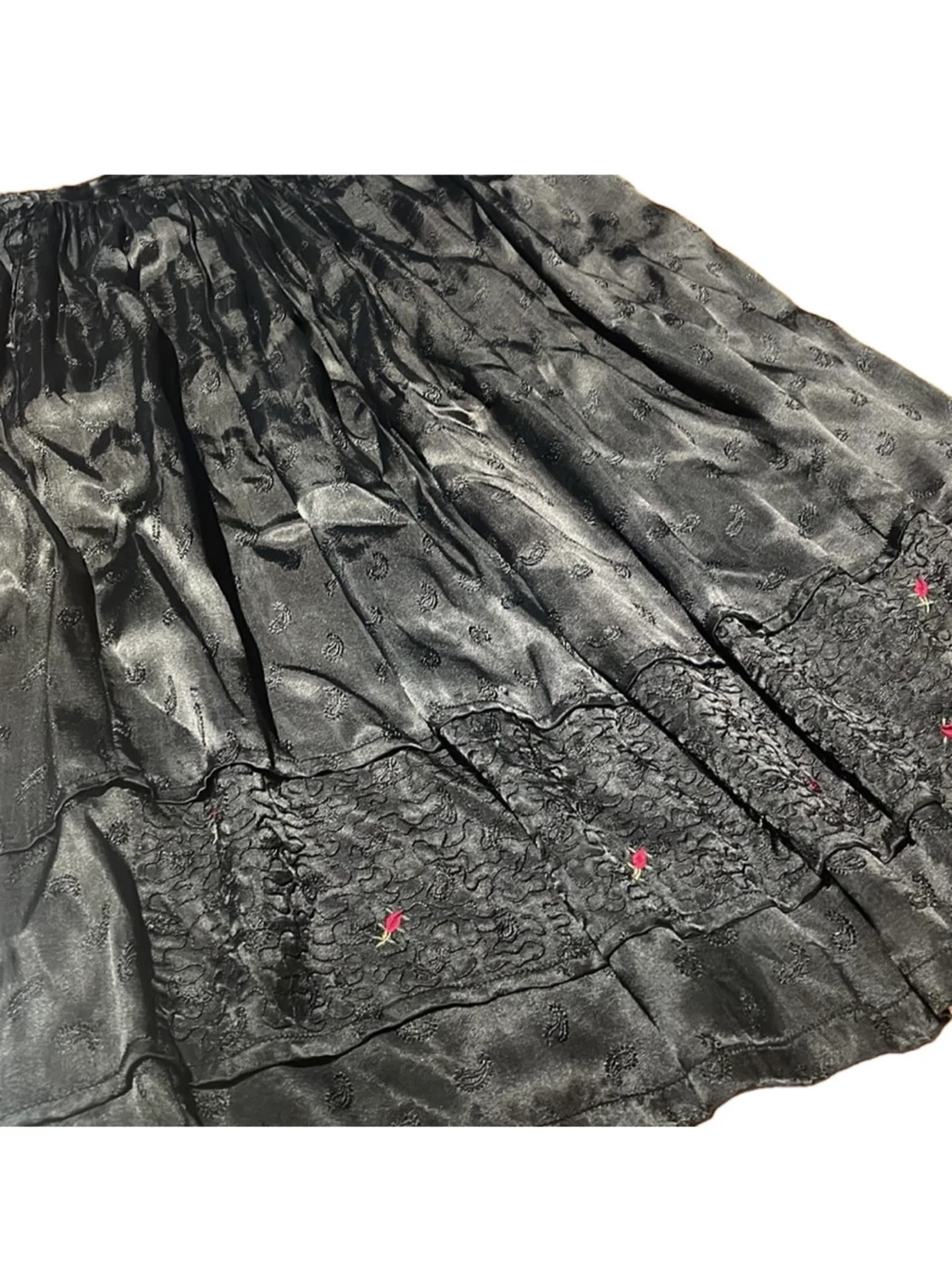 Elegant vintage black skirt with a soft silk-like sheen and delicate woven texture throughout. This piece features a gently gathered waist, flowing midi length, and subtle embroidered floral details along the lower panel, adding quiet charm and artisanal character.
