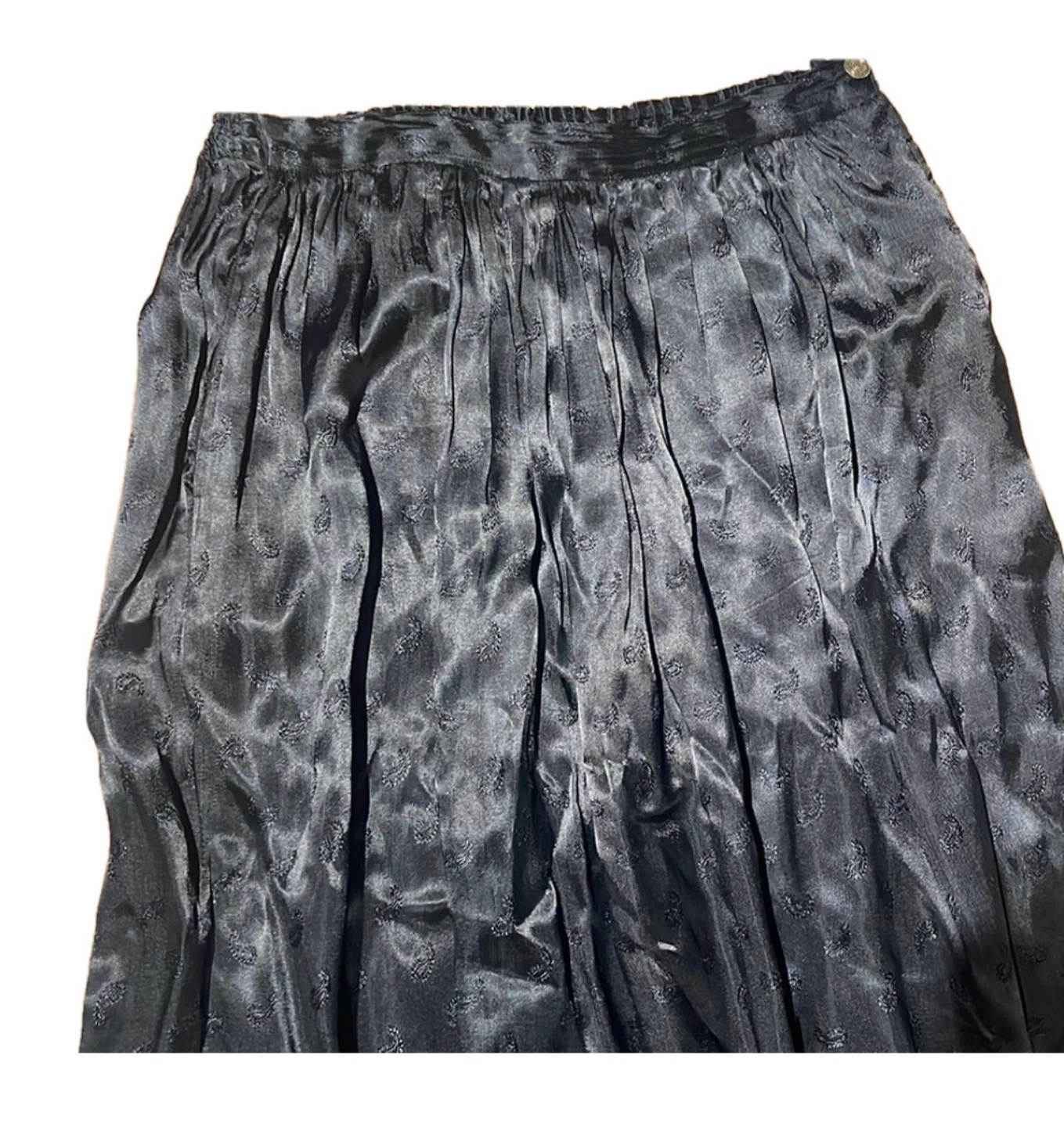 The fabric catches the light beautifully and moves effortlessly, making it perfect for boho styling, cottagecore outfits, or elegant everyday wear. Comfortable elastic waist allows for flexible fit while maintaining a classic silhouette.