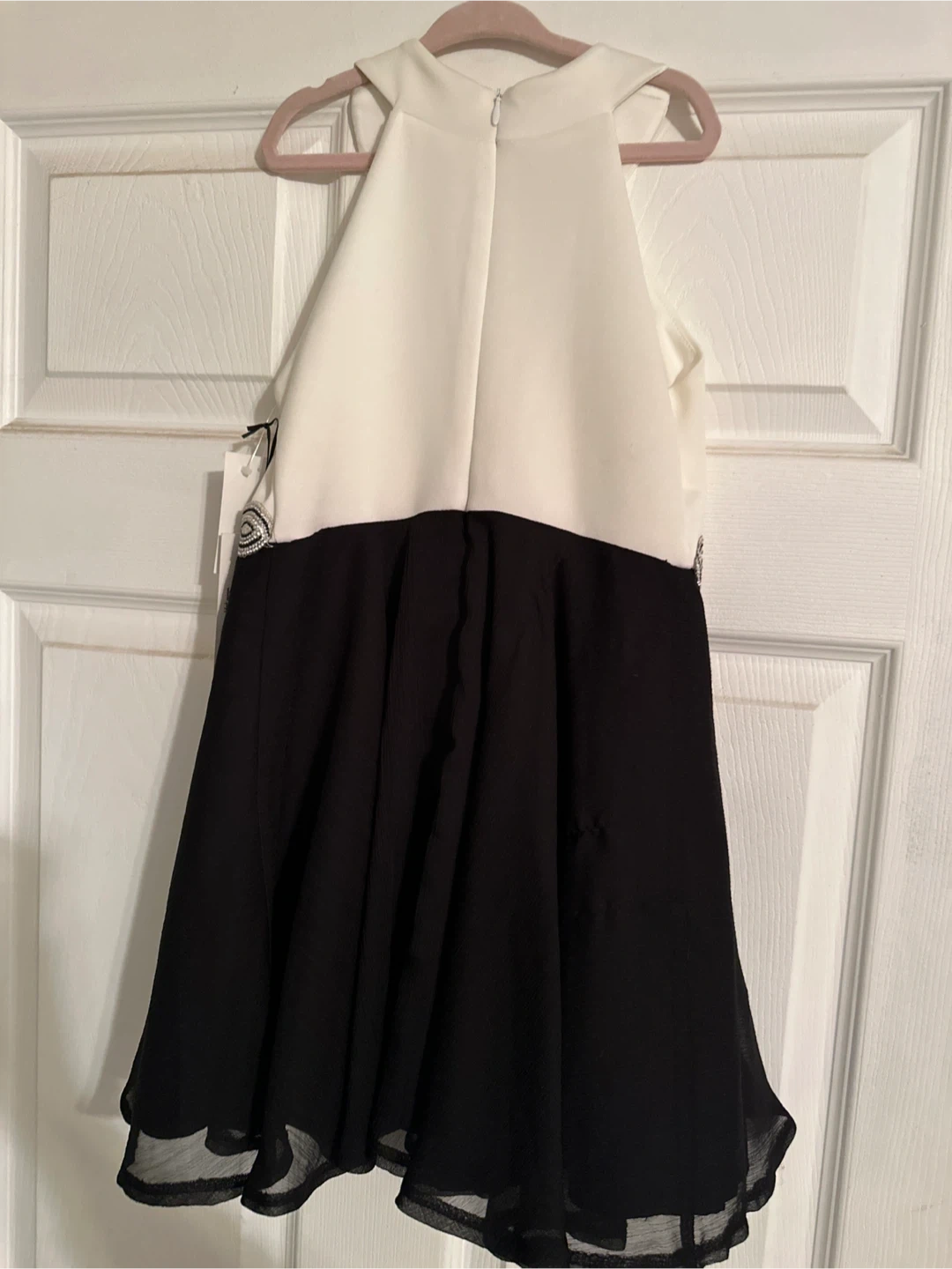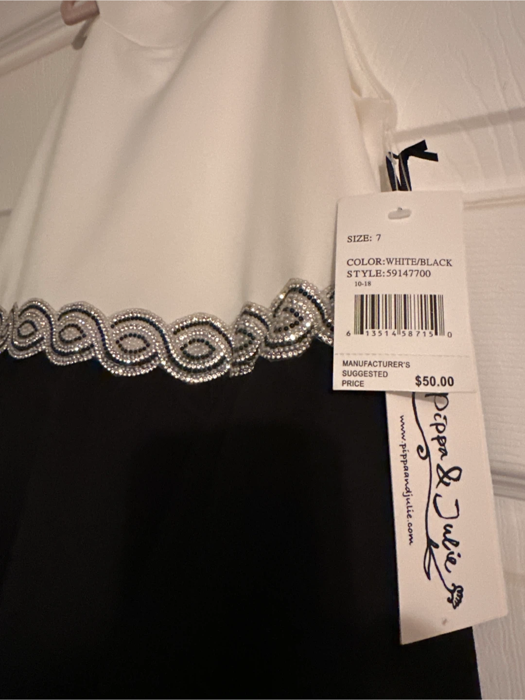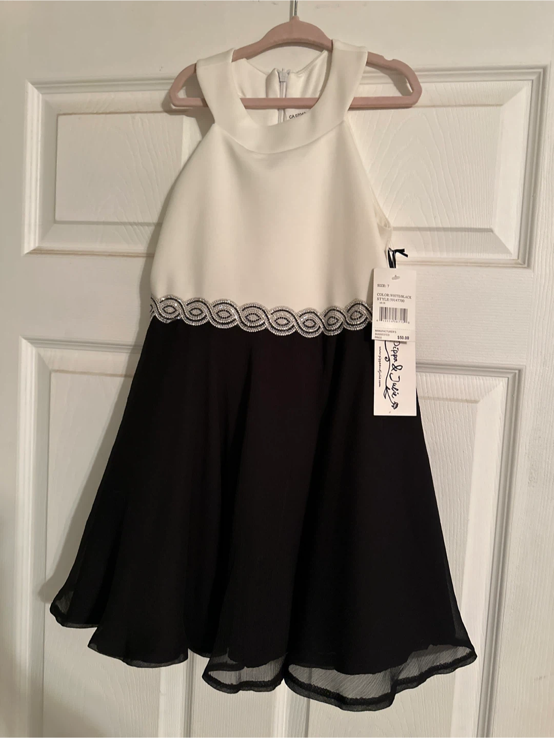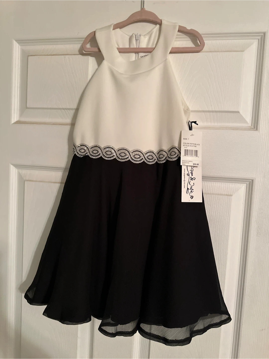 Girls Brand New Beautiful Dippa & Julie dress in size 7 The dress is white and black with a stylish design.