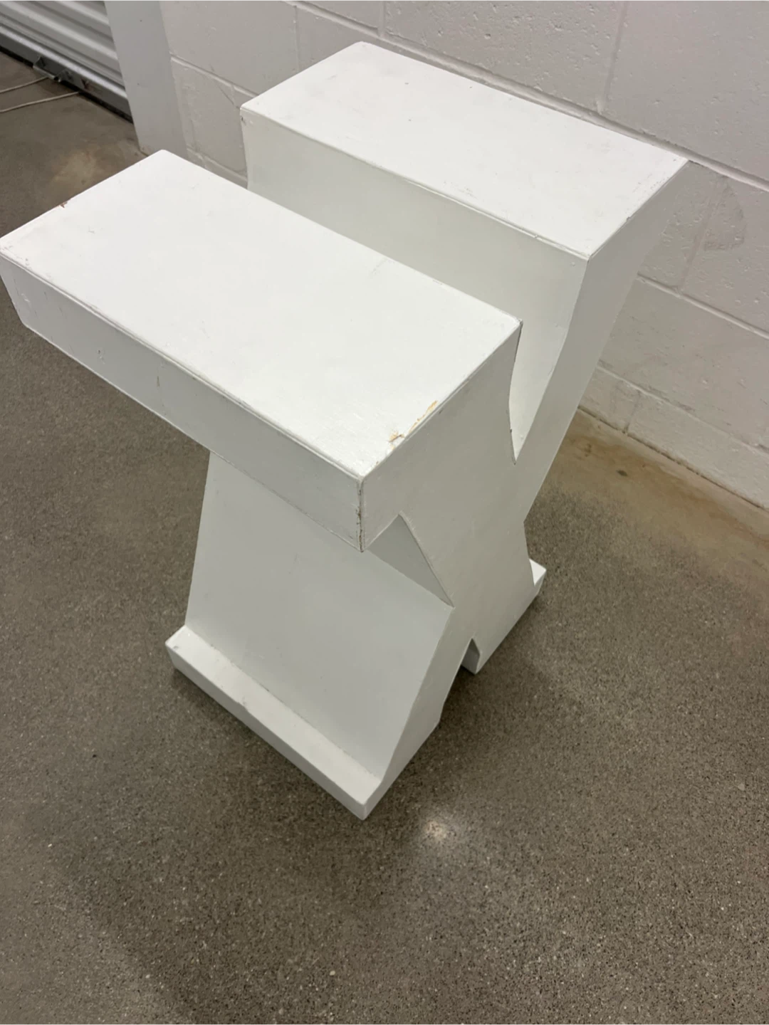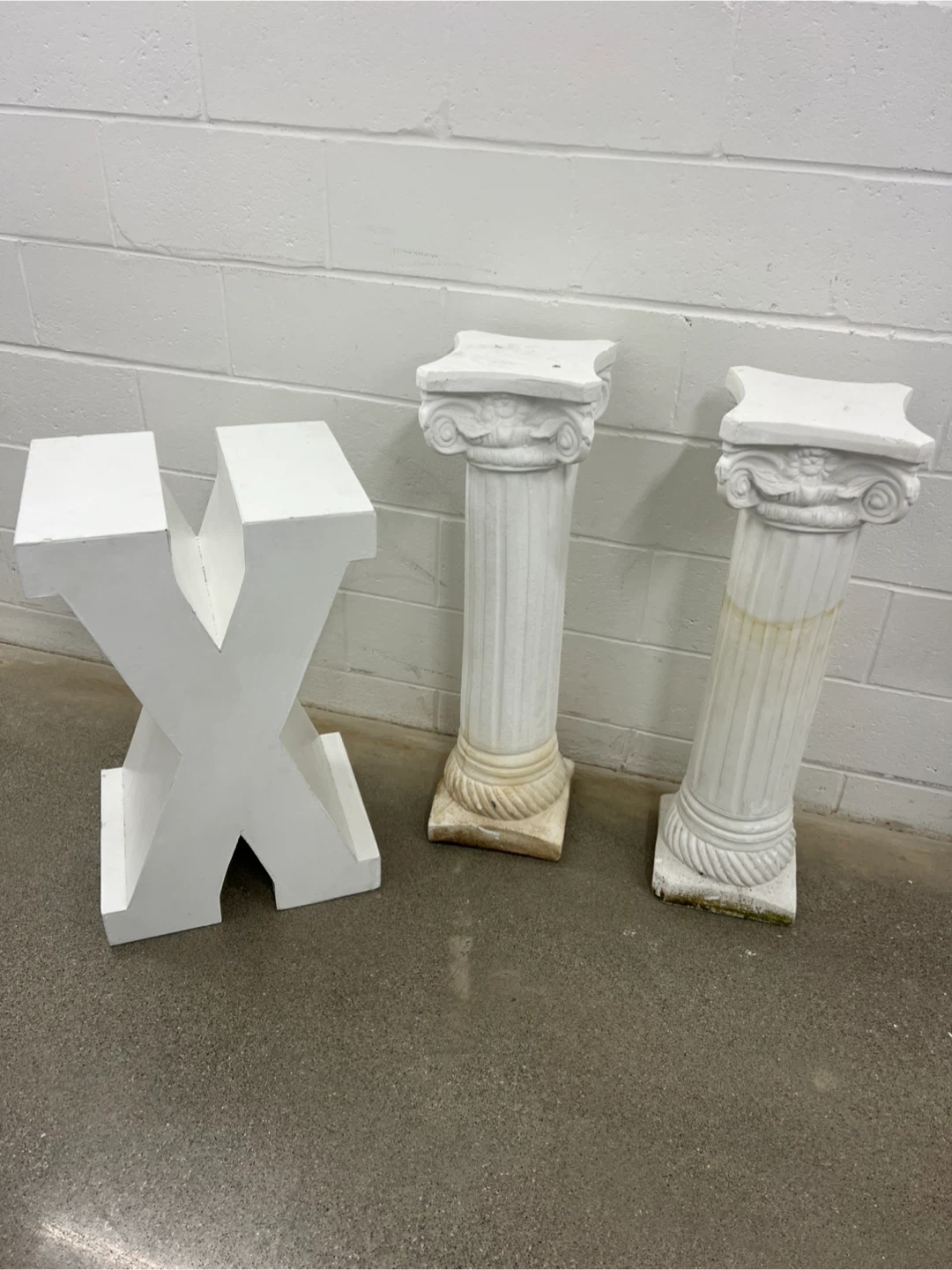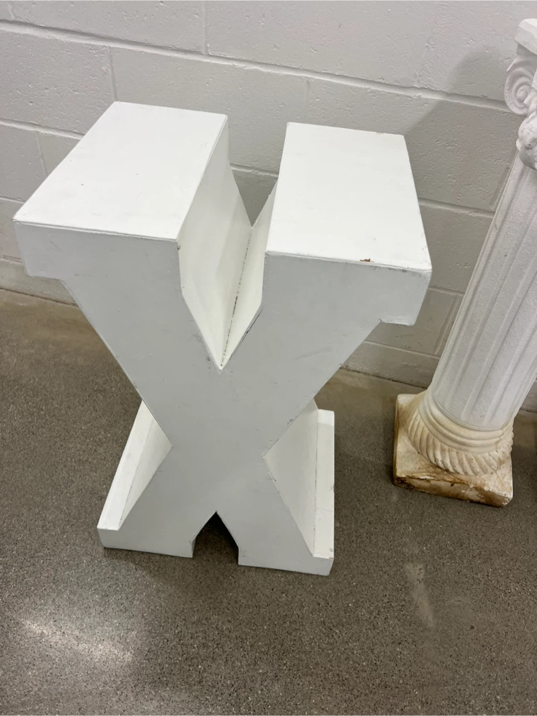Selling a white letter X decoration! It's a unique piece to add to any space. Perfect for initials, themed events, or just as a cool decorative element and 2 pedestals.