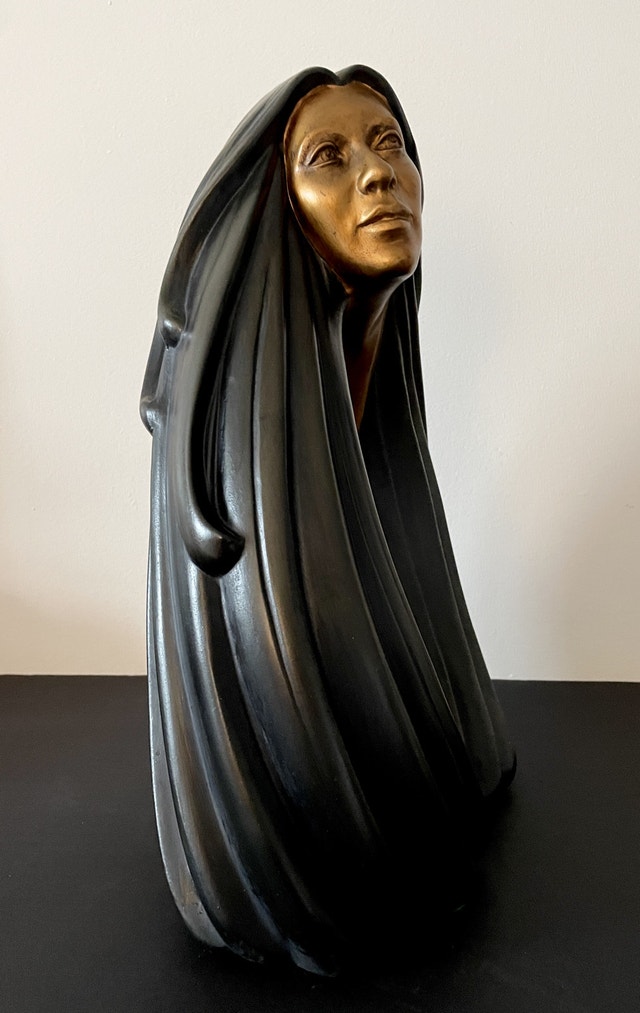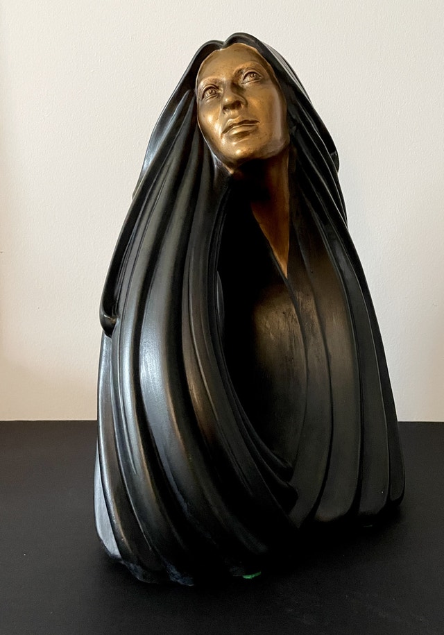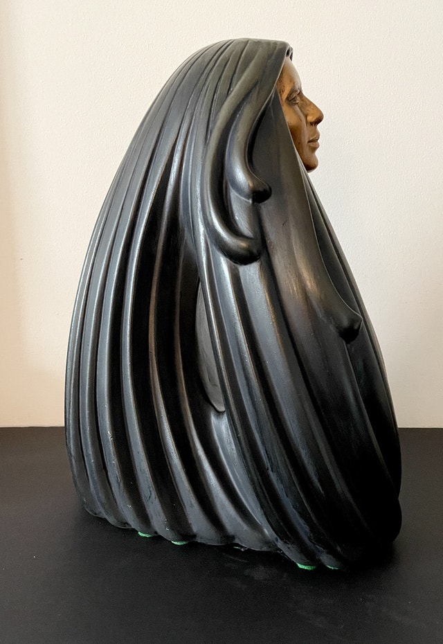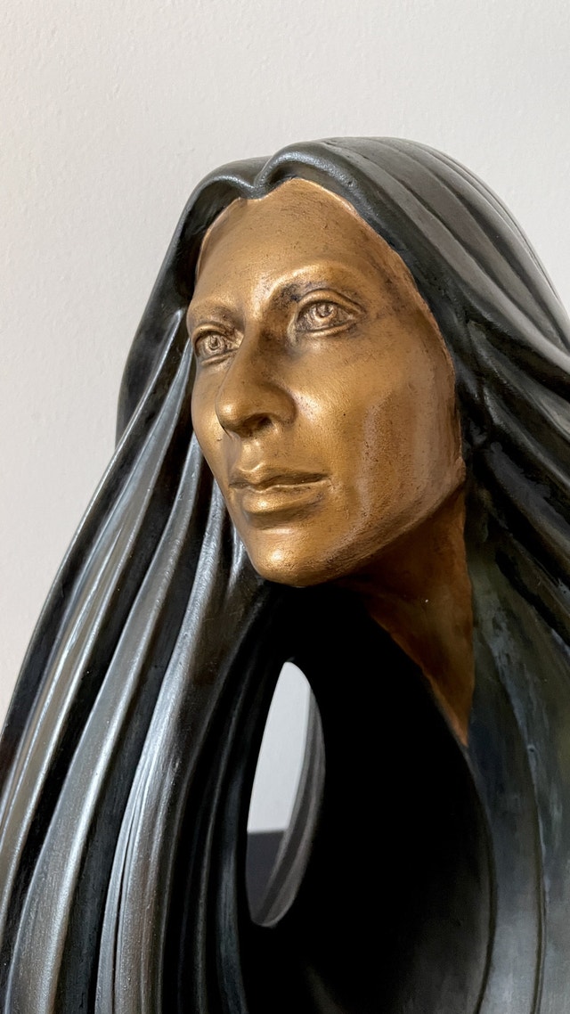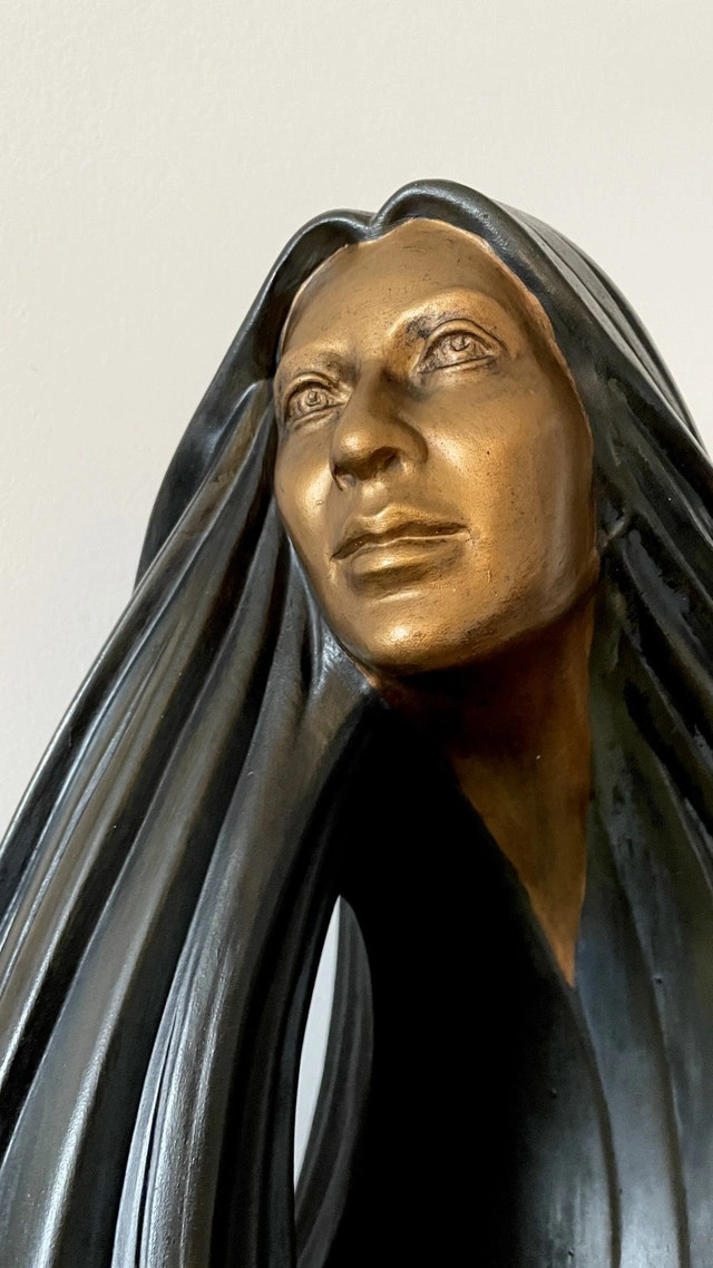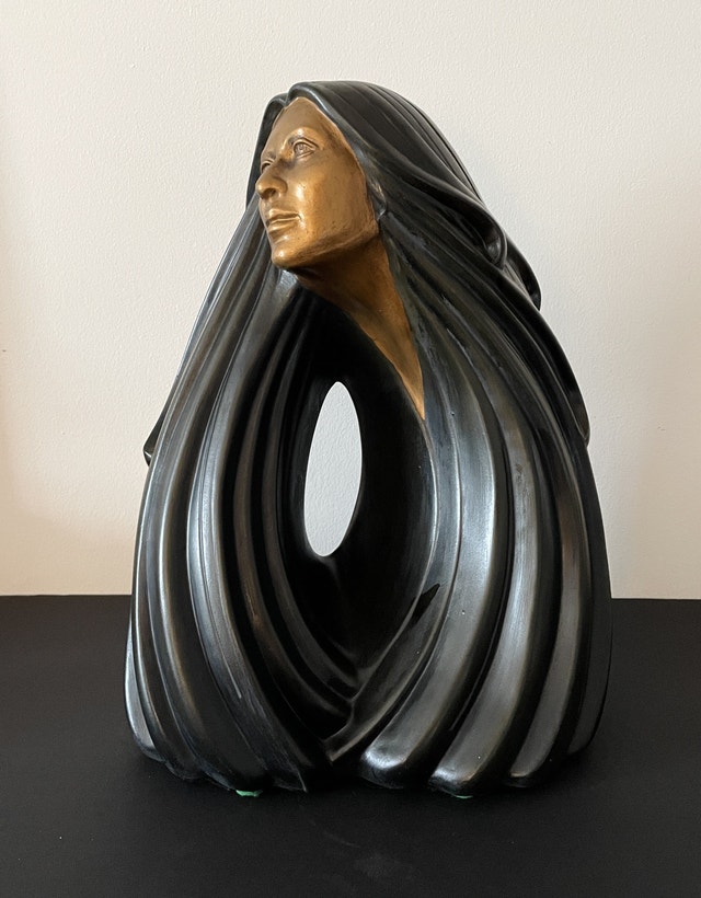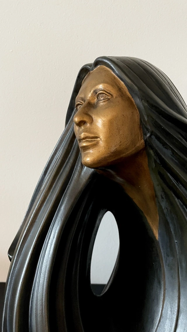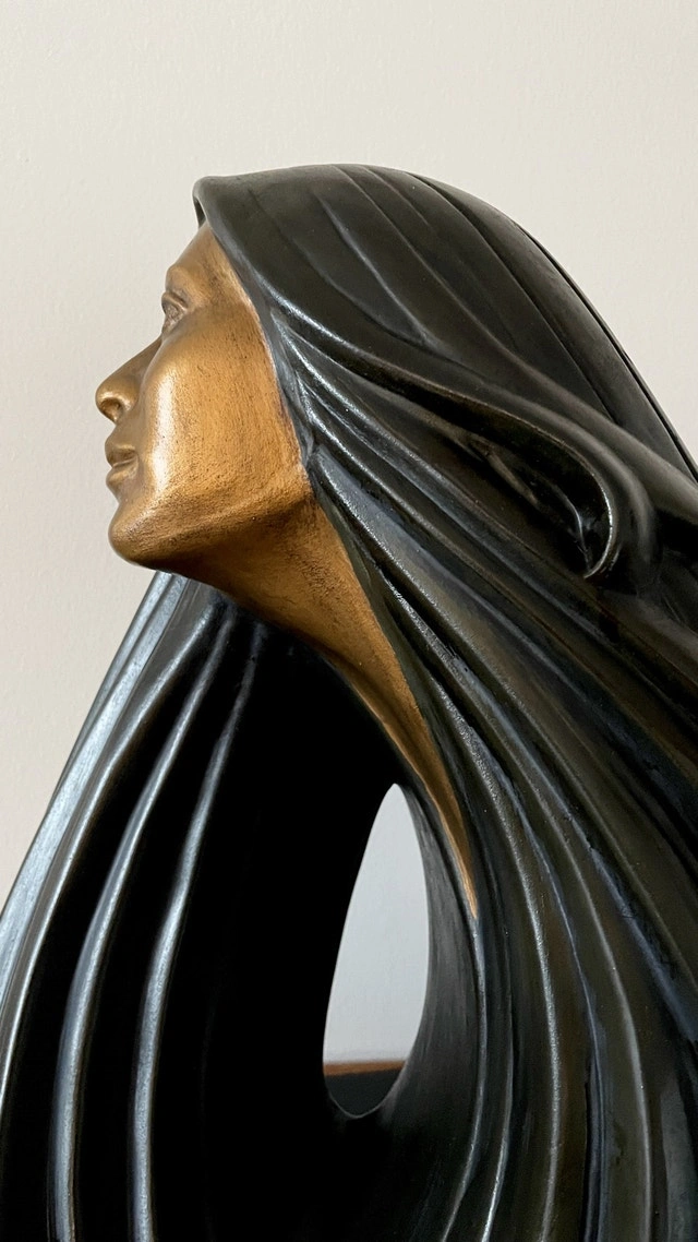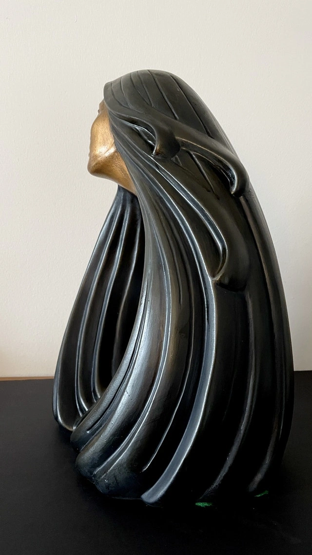 Vintage Art Deco ceramic sculpture. A woman with wave like long hair works as a frame of her face. The gold and the black creates a nice contrast. It stands 16β tall overall.