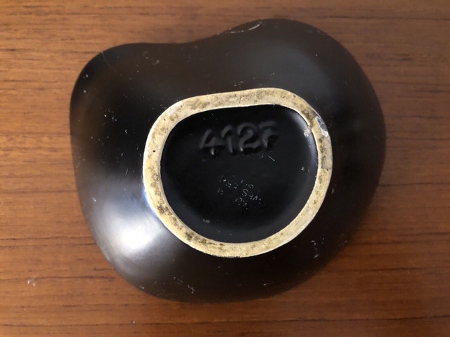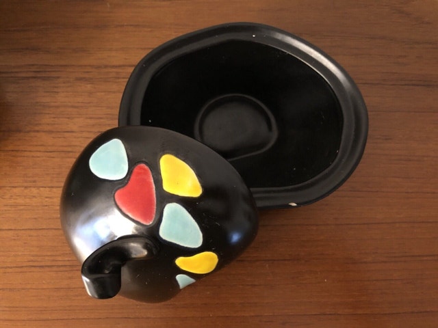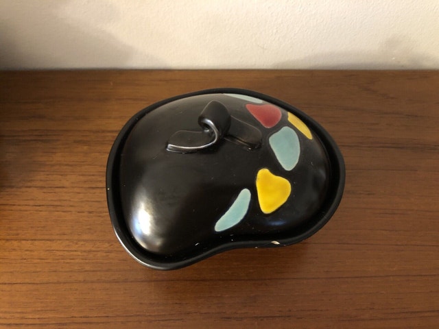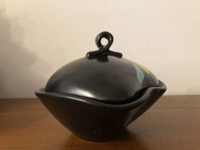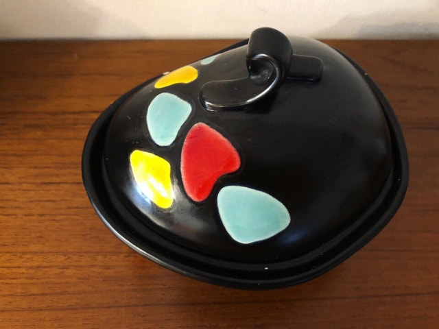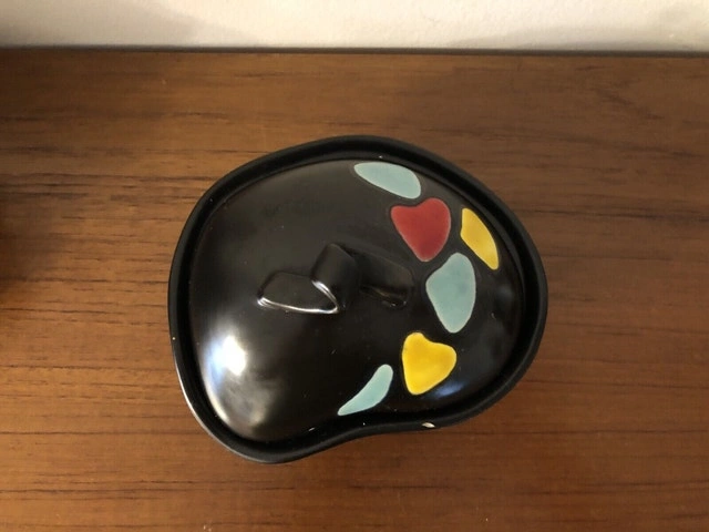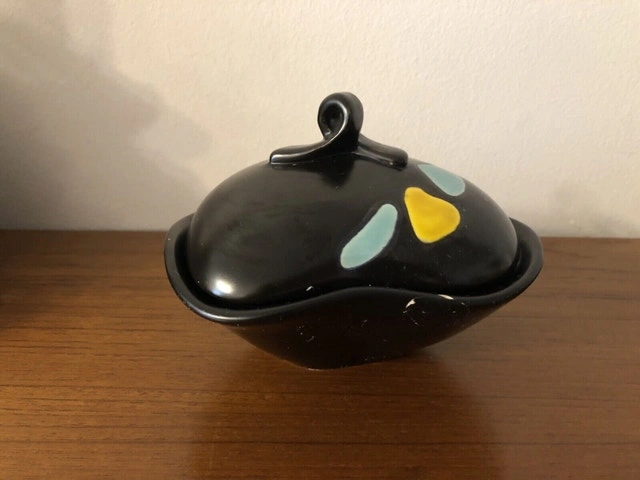 Artist Georg Schmider for Zeller Keramik West Germany. Bottom embossed marking: 4127 A beautiful cute candy/sugar jar The lid is pristine. The rim of the body has some repairs shown in the picture. Still practical and an eye catcher. Dimensions: 5” x 6” x 4” (tall)
