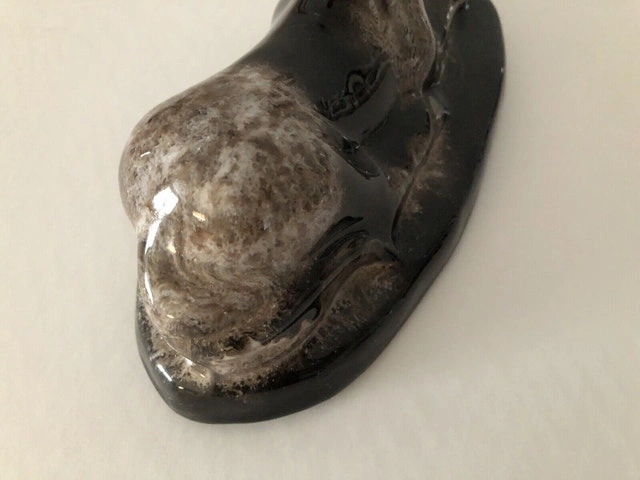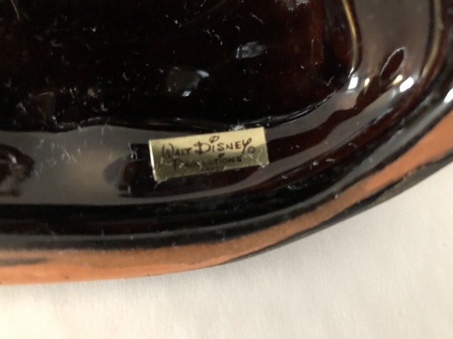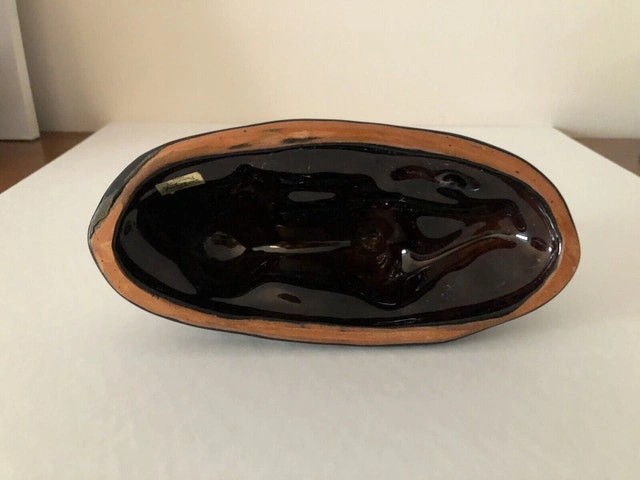 Made in 1970s but in its pristine condition! Glossy flowing glaze in multi tones of brown with beautiful patterns. Walt Disney sticker still on the base. Made of red clay from Collingwood region (You could relate it to Blue Mountain Pottery). 8” wide x 3 3/4” deep x 4 1/2” high