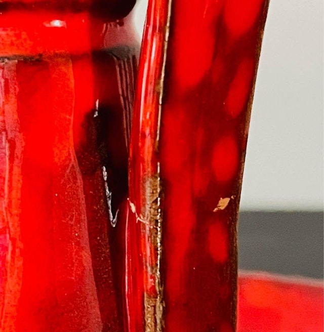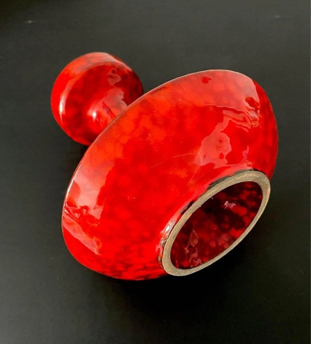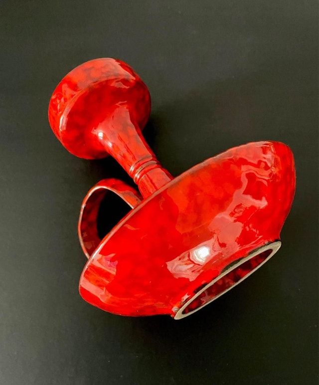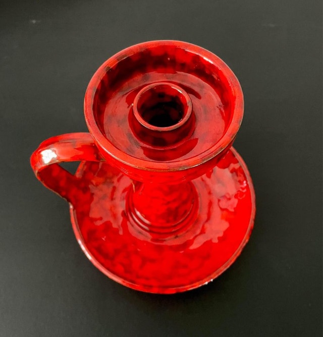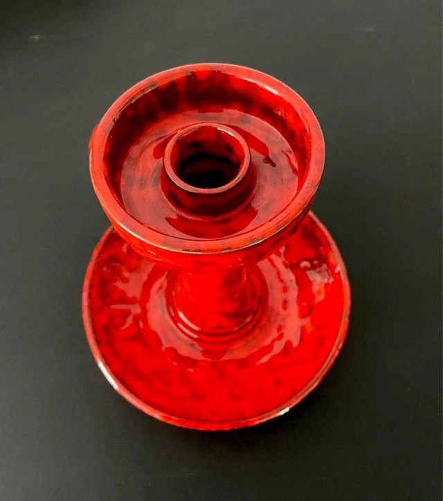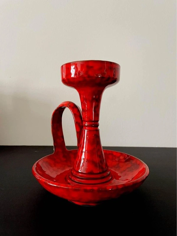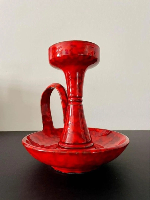 A vintage ceramic Mid Century candle holder. It is beautifully glazed in a very bold and saturated red! No markings found around. It could be made in Canada or Italy (Bitossi pottery?) The handle appears has been repaired (see the last picture). Dimensions: It stands 8” tall and the lower dish diameter is 7”.