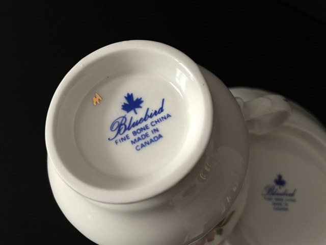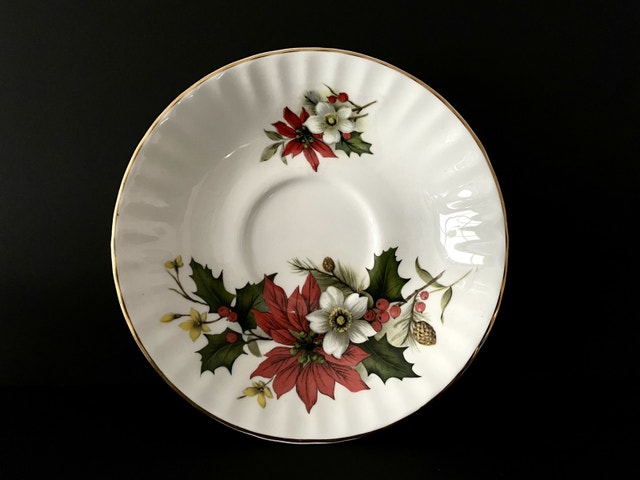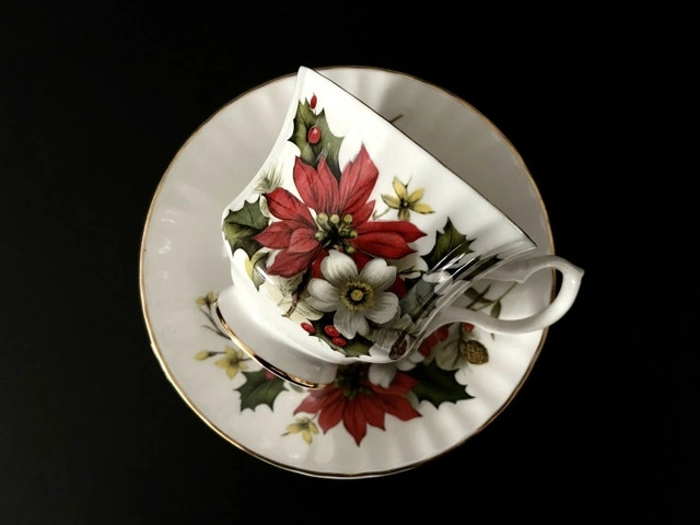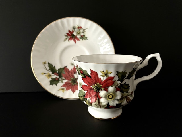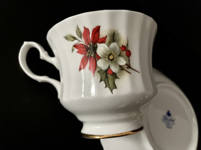 Festive Bluebird china tea cup duo in the Christmas Poinsettia pattern. Crisp white tea cup and saucer with red poinsettia, white dogwood flowers & holly trimmed in gold. Excellent condition with no chips, cracks or crazing, perfect for setting a beautiful table for the holidays. Made in Canada