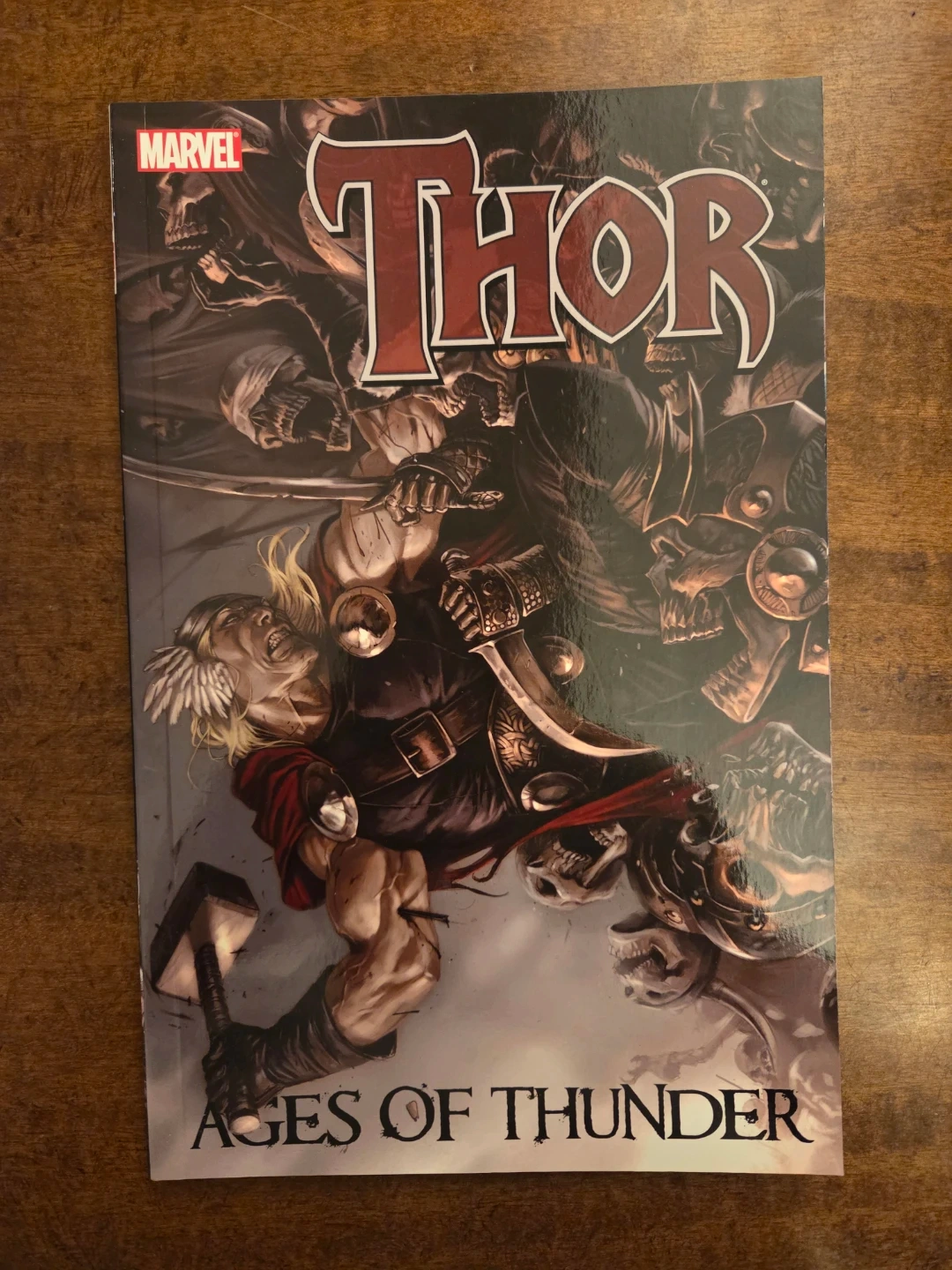 "As the Mighty Thor reclaims his rightful spot in the Marvel Pantheon, we join Matt Fraction and Patrick Zircher as they examine the triumphs and tragedies that have befallen the God of Thunder across the eons. As all the things he holds dearest are threatened by unimaginable forces of evil, Thor must rise up, again and again, to hold the line against terror and chaos as only the God of Thunder can! Plus, For countless millennia, over and again has the mighty, thunderous, impetuous, petulant god Thor raged and rebelled against the leadership of his father and lord, the all-powerful Odin. The capricious tantrums of a selfish titan, spoiled by his own power. But... ODIN HAS HAD ENOUGH! And so as the cycle is repeated in all ages, Thor must ultimately face the fullest wrath of the enraged All-Father! Colelcts Thor: Ages of Thunder One-Shot, Thor: Reign of Blood One-Shot, Thor: Man of War One-Shot, and Thor God-Sized Special."