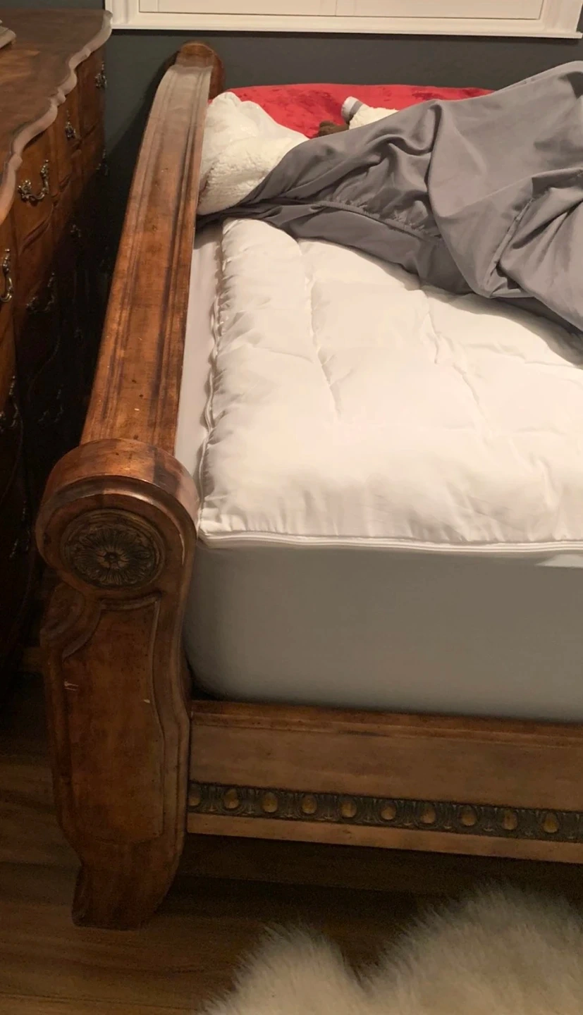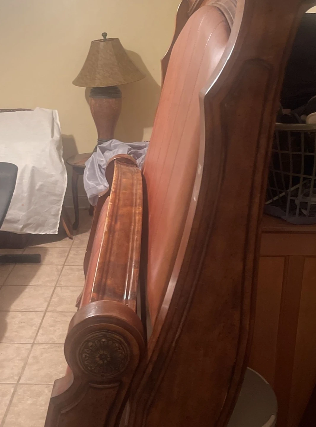In good condition queen size wood bed with leather on headboard and footboard. Includes mattress. Asking $200 or best offer! Very heavy! Need gone asap!