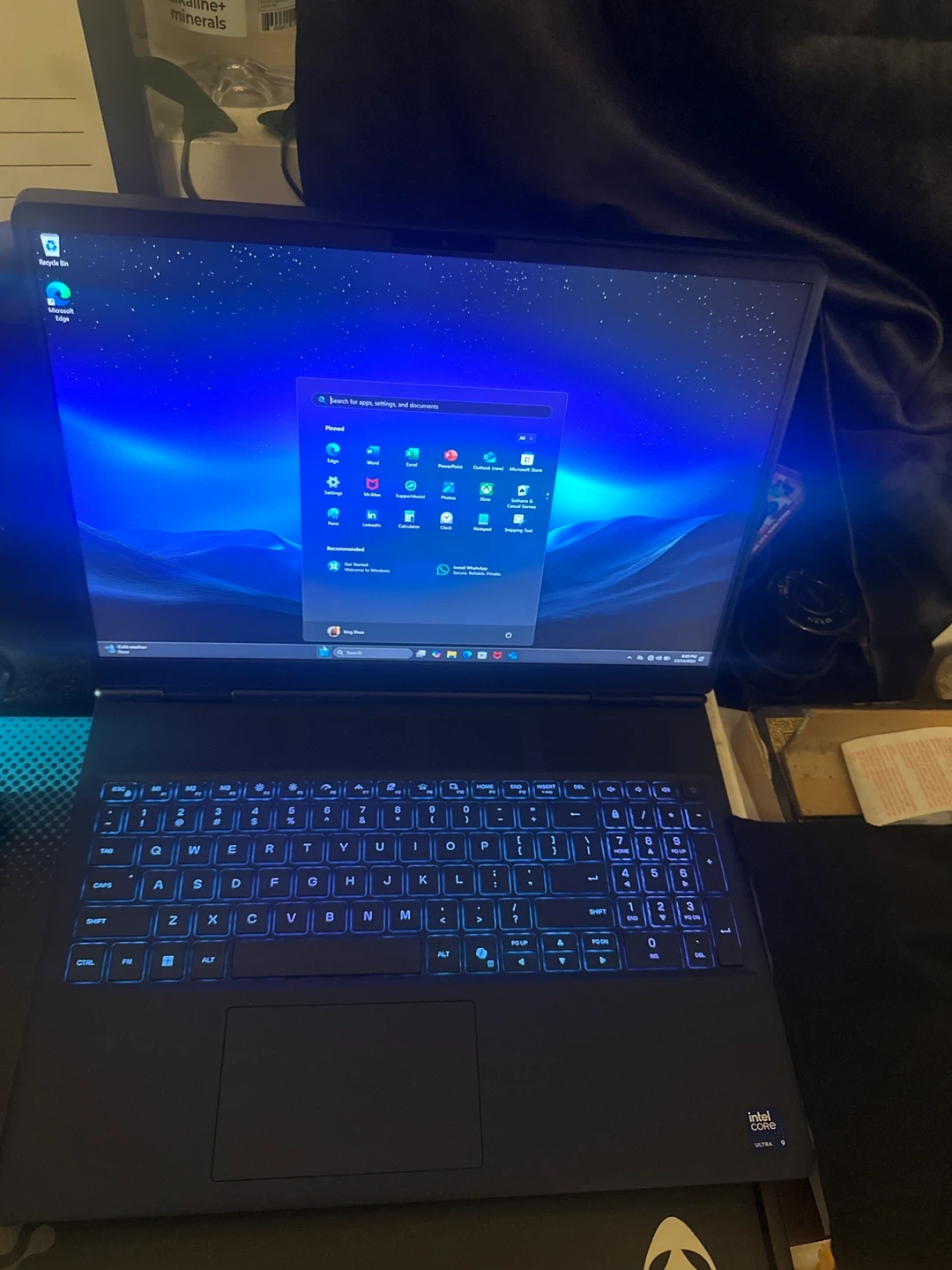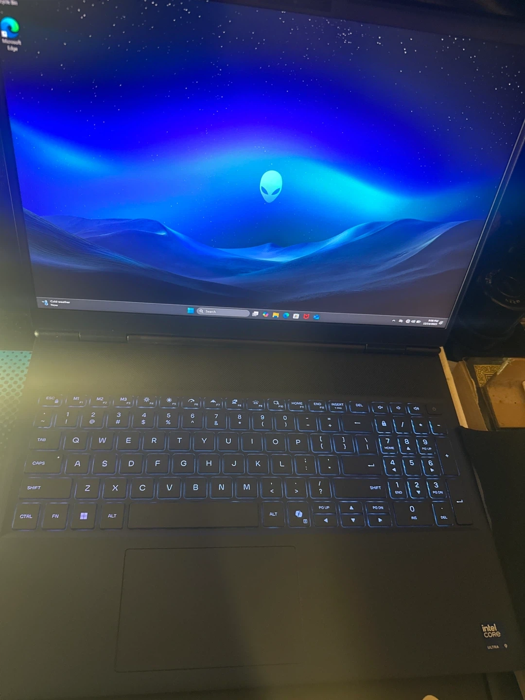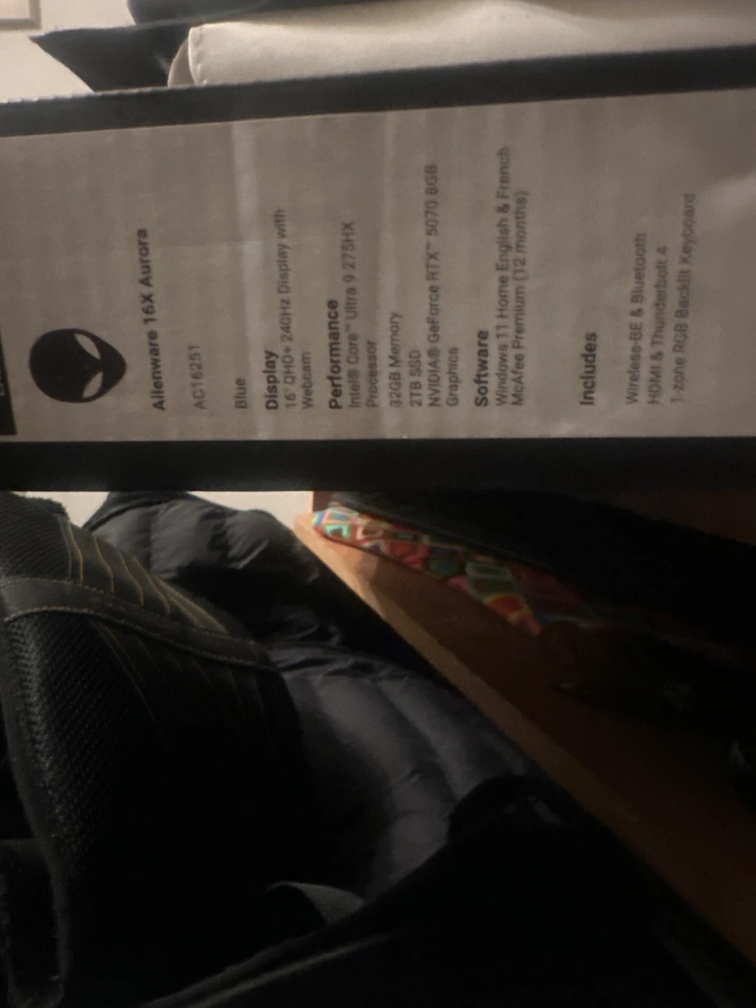Selling an Alienware 16X Aurora laptop in blue. It comes with an Intel Core Ultra 9 275HX processor, 32GB of memory, and a 2TB SSD. The display is a 16" QHD+ 240Hz display with a webcam. Also includes Windows 11 Home English & French and McAfee Premium (12 months).