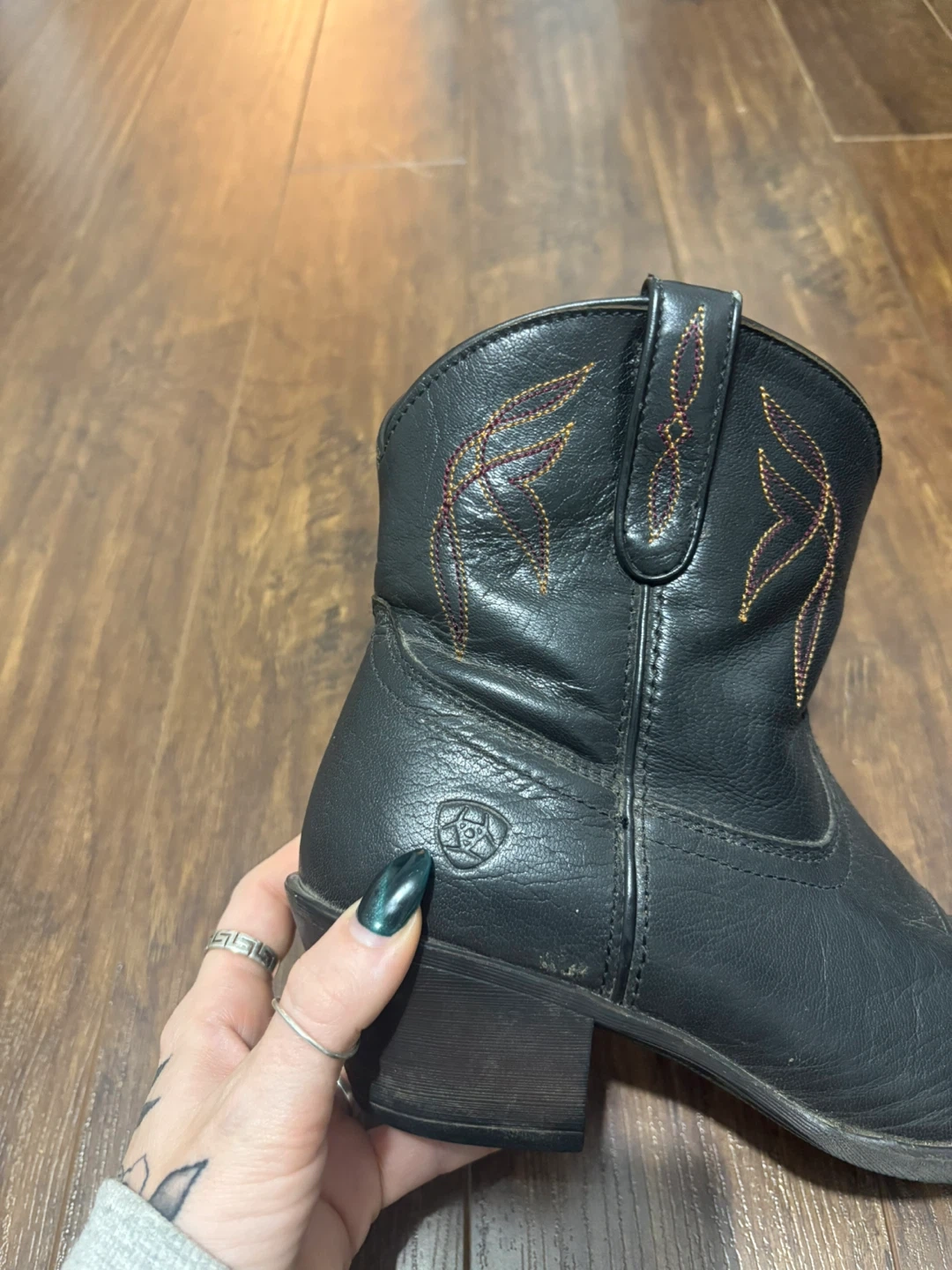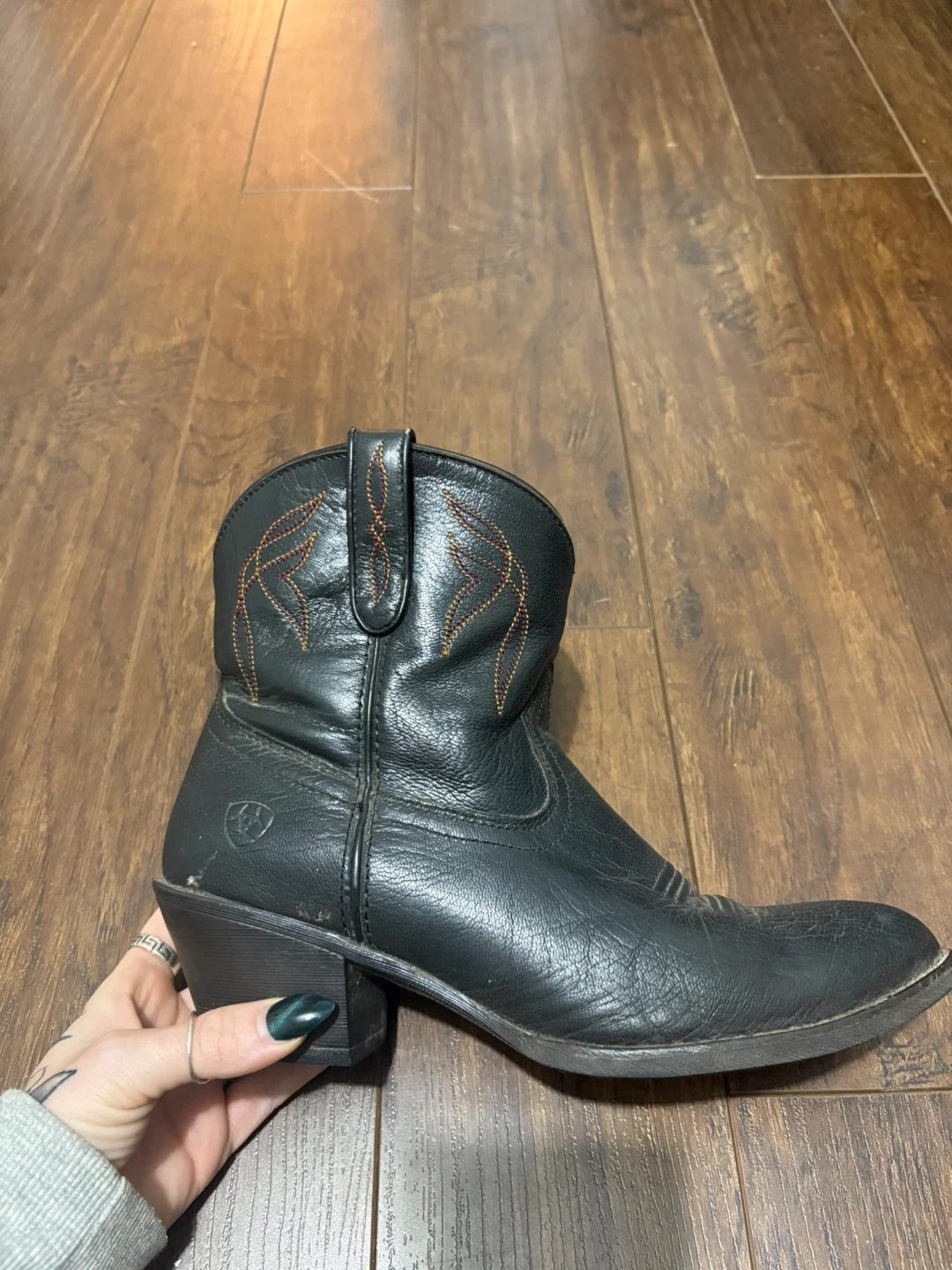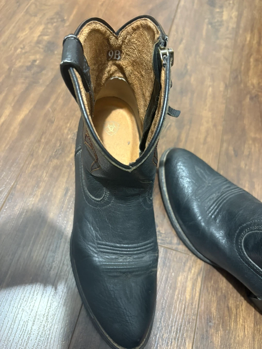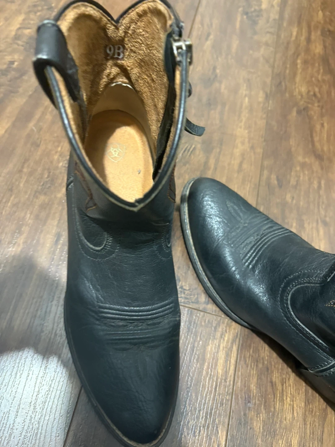 Selling a pair of Ariat cowboy boots in black leather. They are a women's size 9B. There are some signs of wear, but they are still in good condition and ready for a new owner!