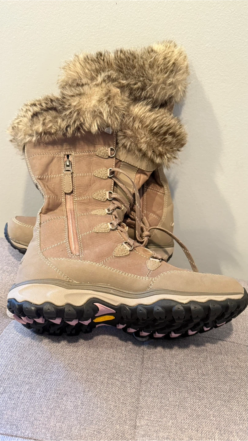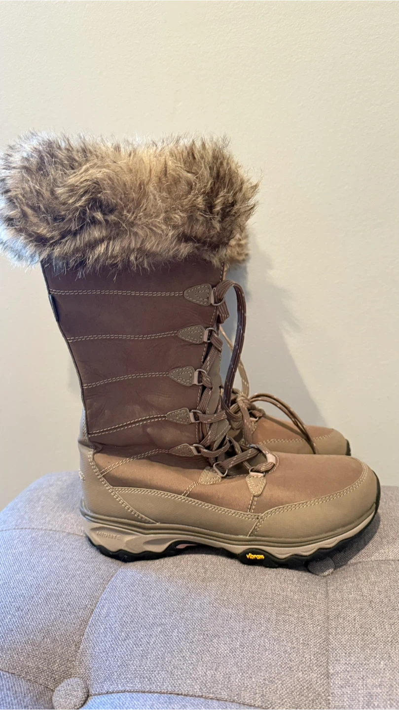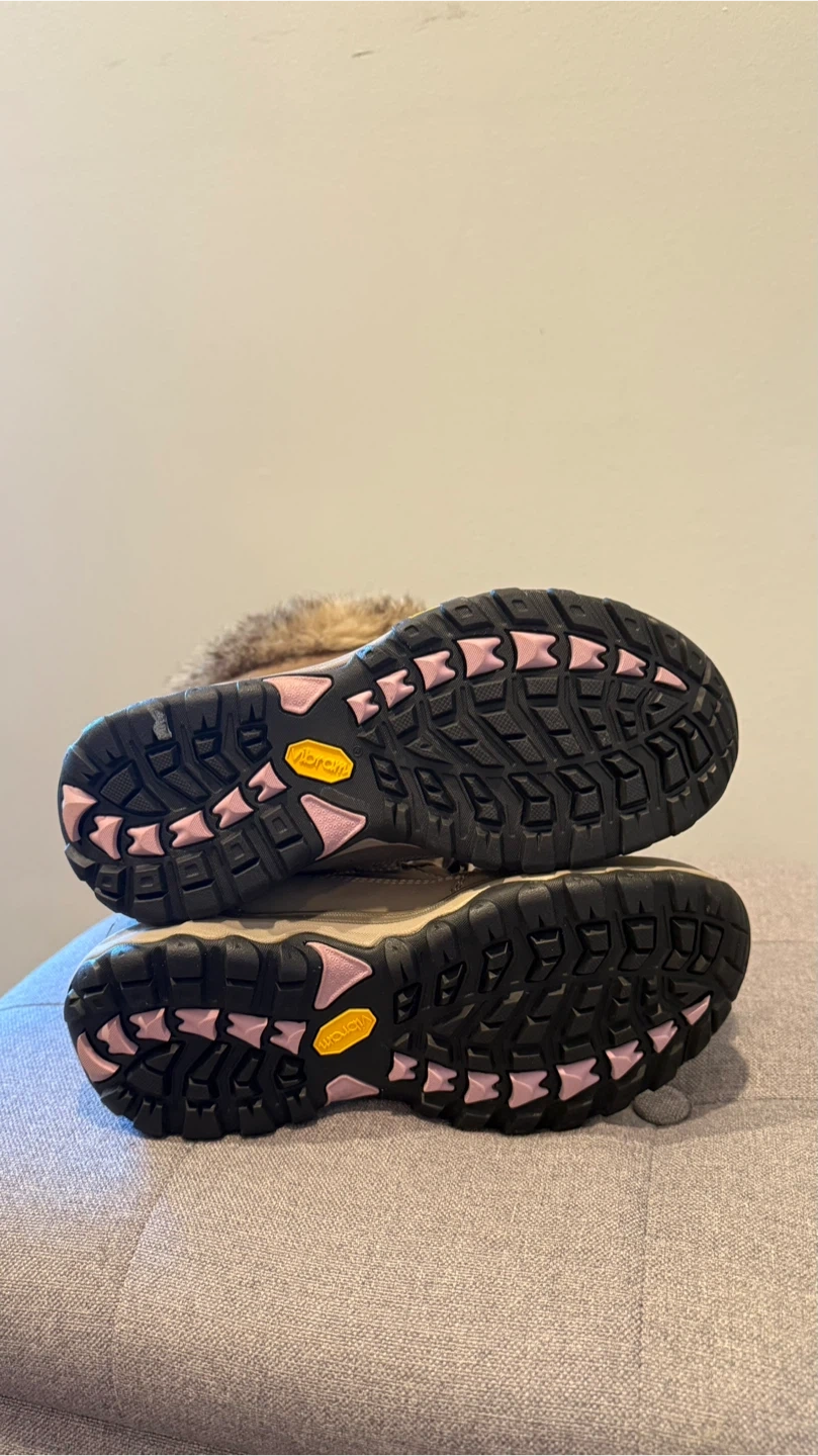 These Merrell winter boots are ready for the snow! They feature a leather exterior and faux fur trim. The soles are Vibram for great traction. They are in good condition.