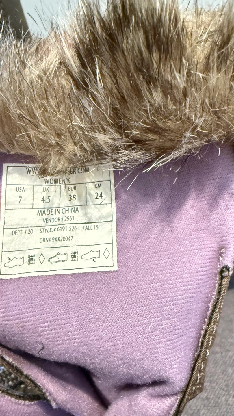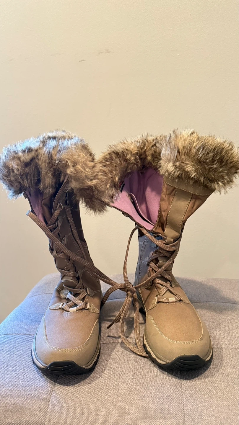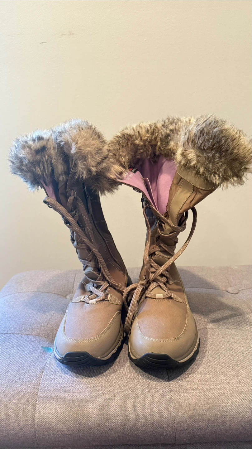 These Merrell winter boots are ready for the snow! They feature a leather exterior and faux fur trim. The soles are Vibram for great traction. They are in good condition.