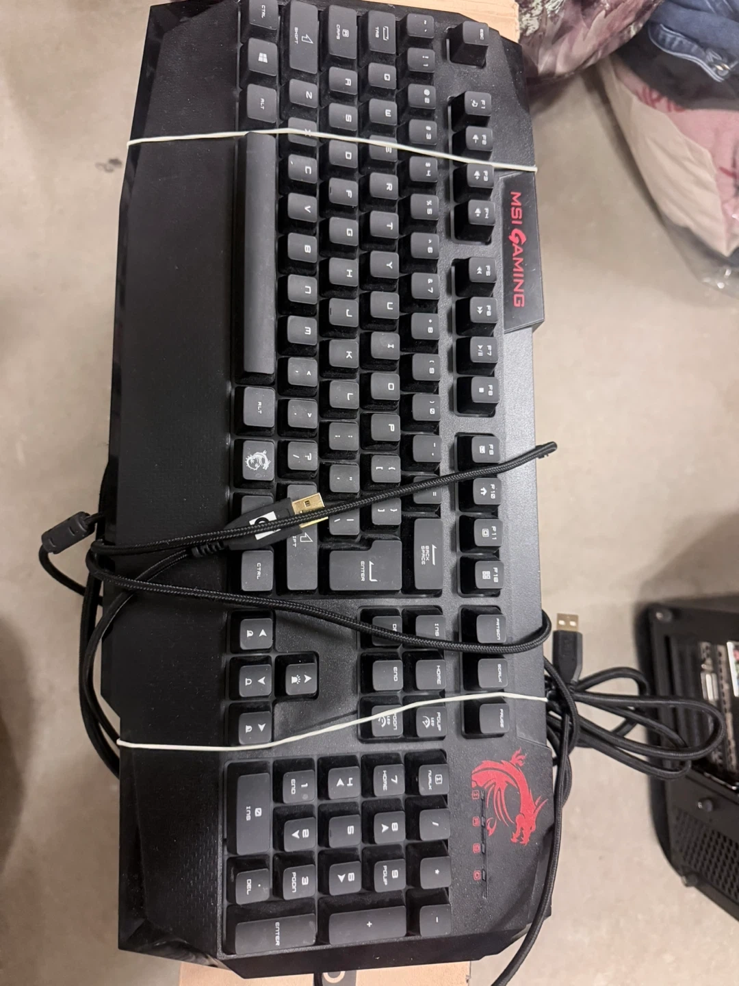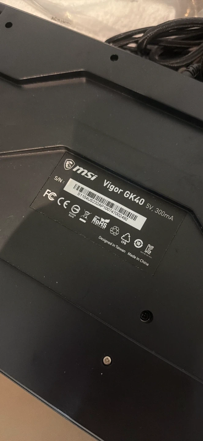 Selling a MSI Vigor GK40 gaming keyboard. It's in good condition and ready for a new owner. It has a cool design with the MSI logo and a dragon. Perfect for gaming!