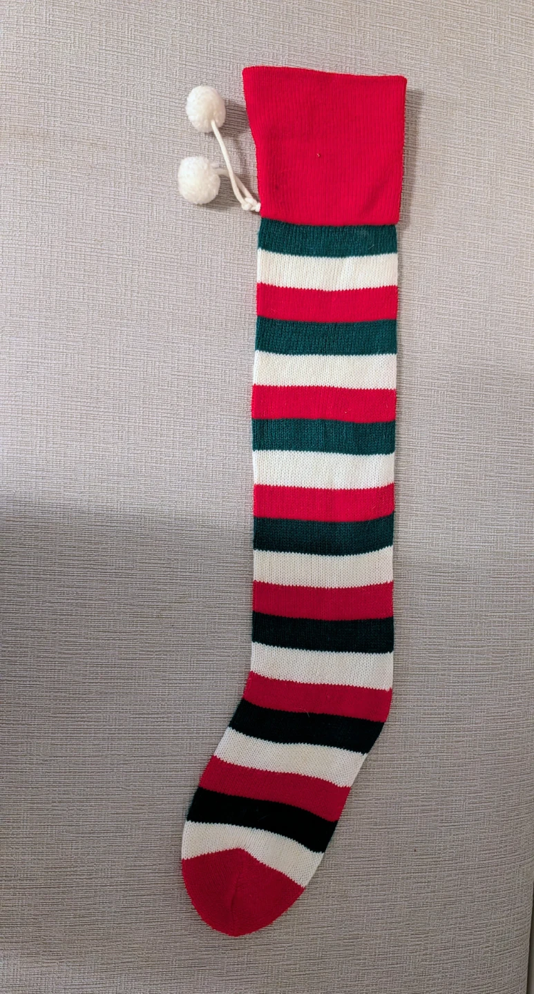 Here's a colourful striped Christmas stocking! It features red, green, white, and black stripes. Perfect for adding a festive touch to your holiday decor
