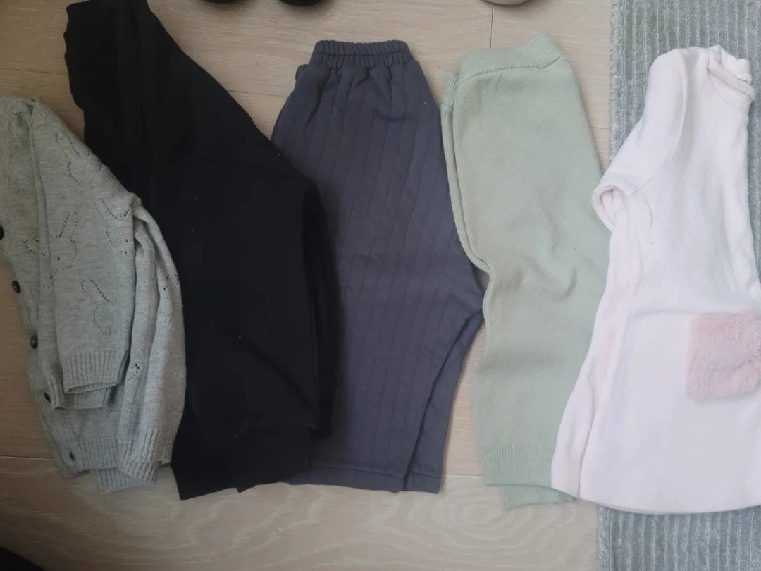 Selling a bundle of baby/toddler clothes! Includes a gray cardigan, black pants, gray-blue ribbed pants, light green pants, and a light pink dress. Perfect for your little one!