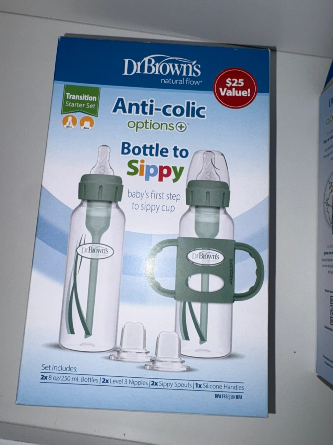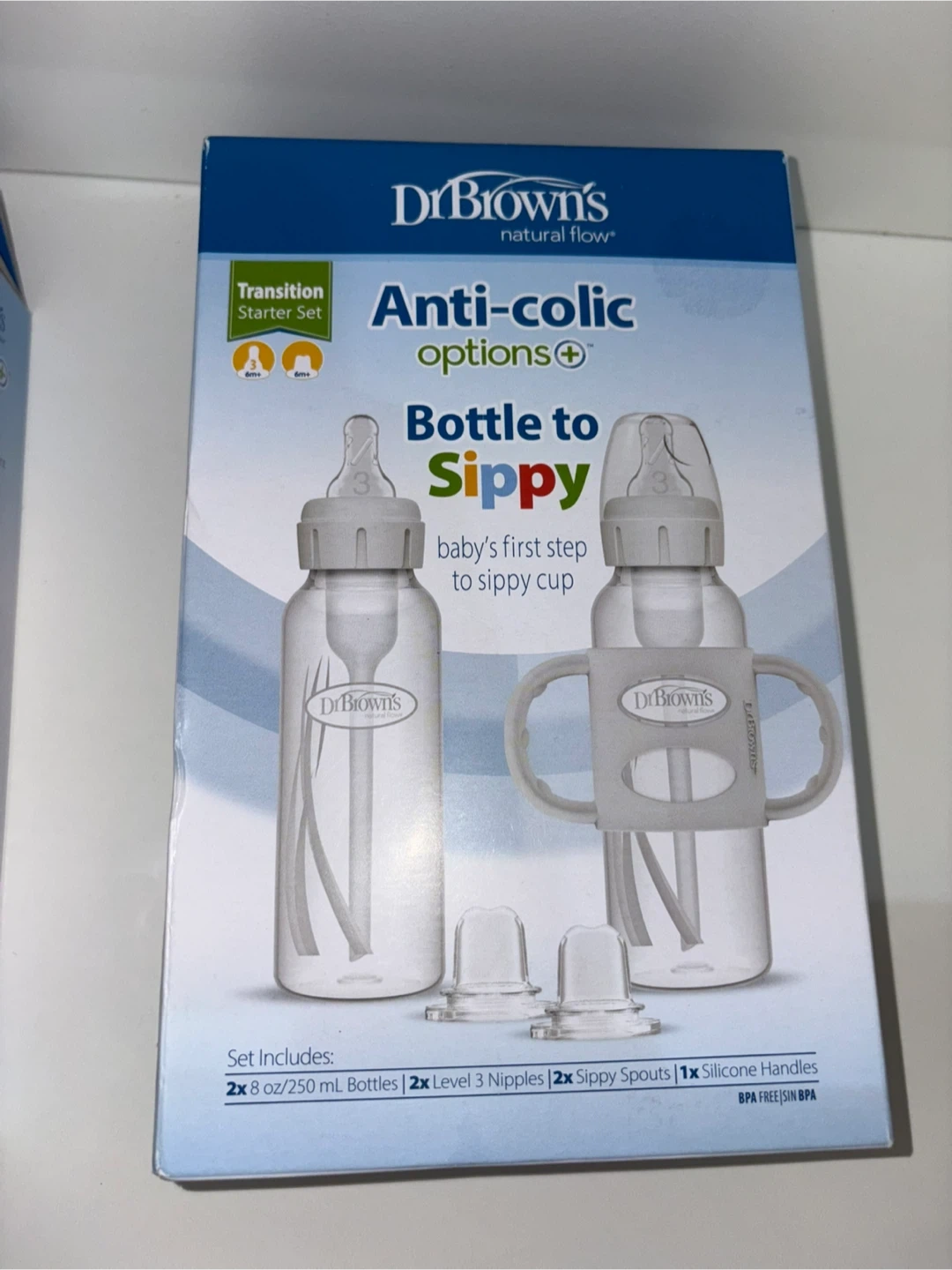 Selling a Dr. Brown's Natural Flow Anti-Colic Options+ Bottle to Sippy Transition Starter Set! It includes 2x 8 oz/250 ml bottles, 2x Level 3 nipples, 2x sippy spouts, and 1x silicone handles. This set is BPA free