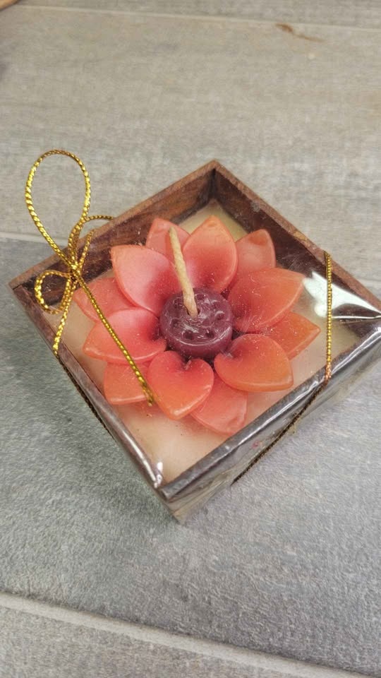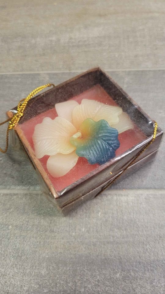 Beautiful decorative candles featuring hand-poured flower designs set into solid wood cube holders. Each piece is individually wrapped and finished with a gold hanging cord, making them perfect for gifts, party favors, weddings, or home décor.