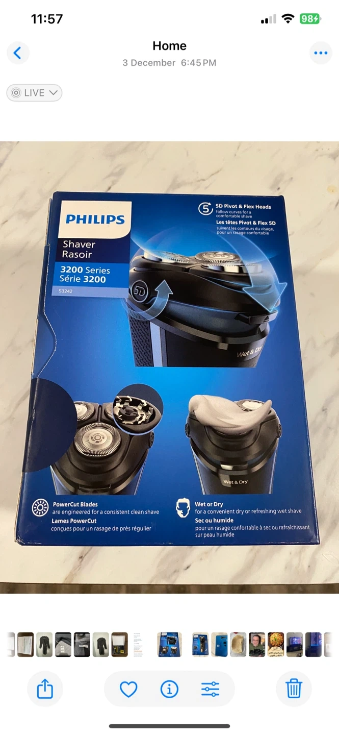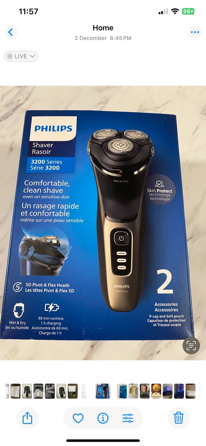 Selling a Philips Shaver Rasoir from the 3200 Series! It's in great condition and comes with all the original accessories and the box. This shaver is designed for a comfortable and clean shave, even on sensitive skin. It features 5D Pivot & Flex Heads and can be used wet or dry. Includes a power adapter and a pouch for storage