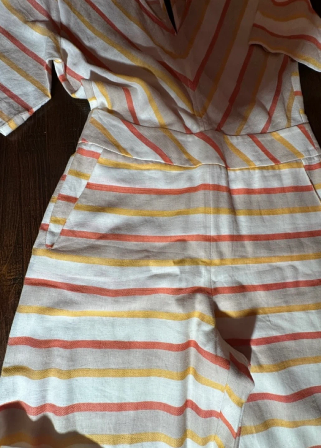 Brazil, featuring a flattering V-neckline, wide leg silhouette, and soft neutral stripes in warm earthy tones.