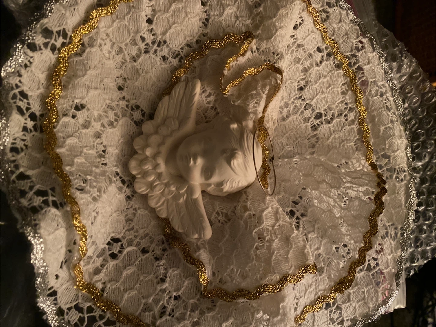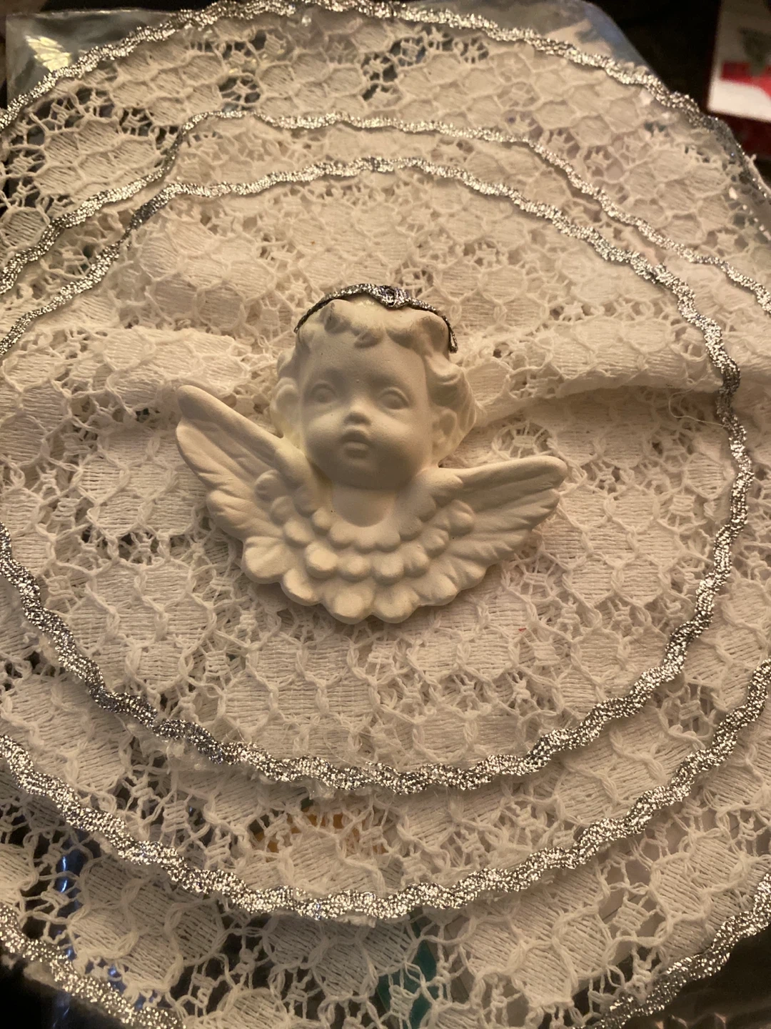 Two cute ceramic angel ornaments with delicate lace detailing for your home decor or Christmas tree! It's in great condition and ready to add a touch of charm to any space