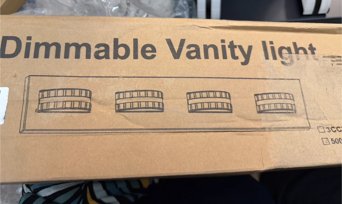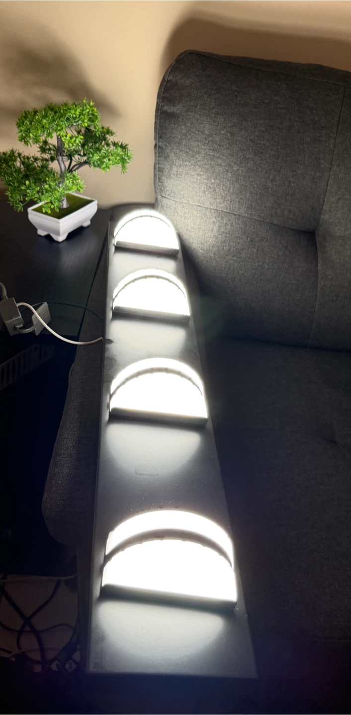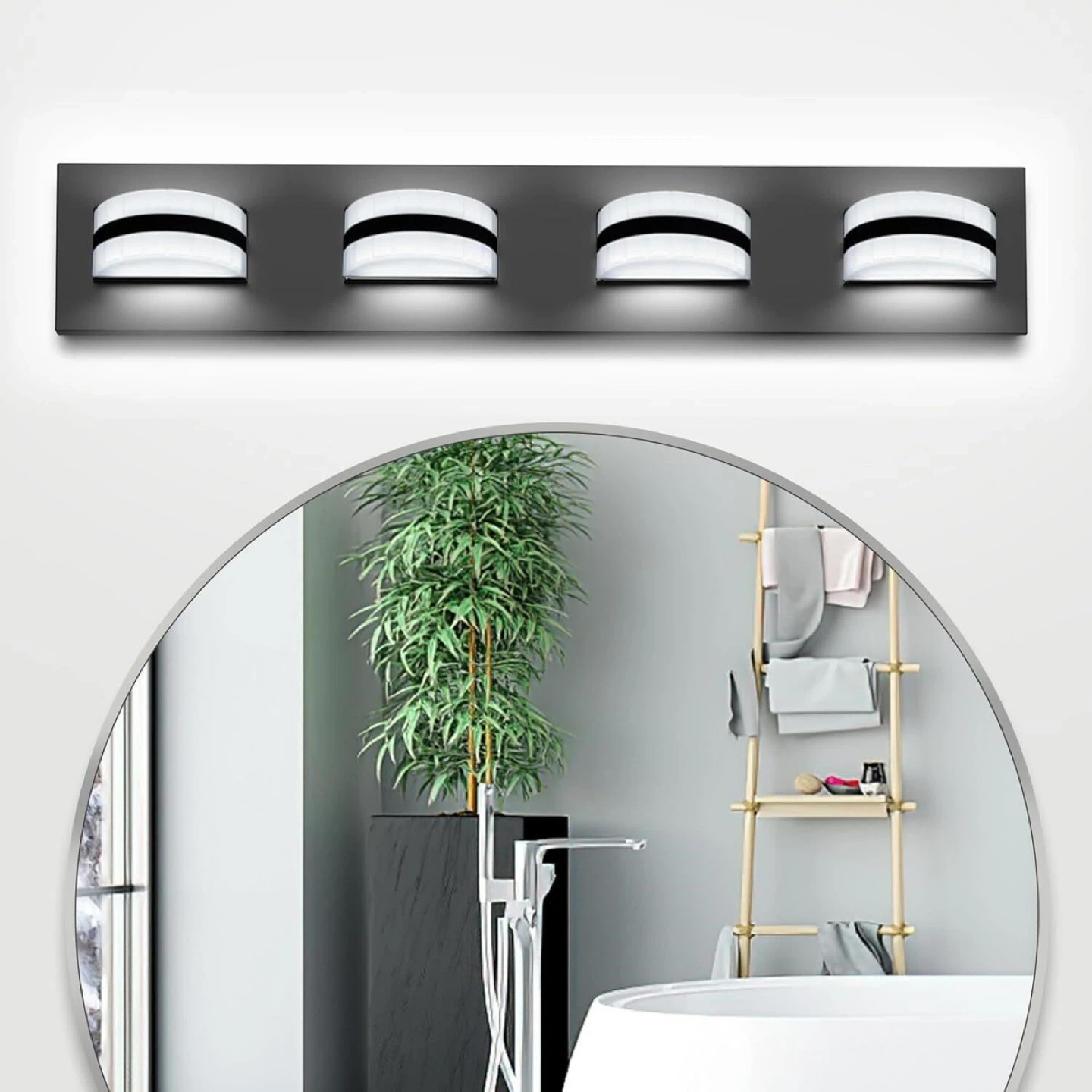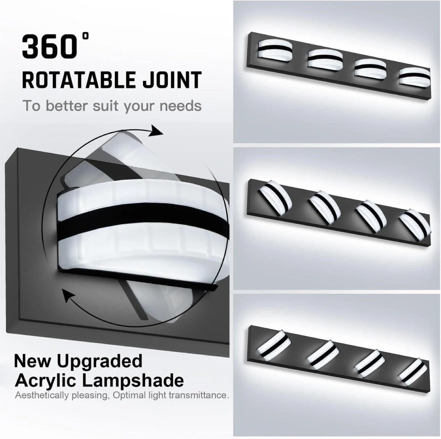 Selling a new bathroom vanity light fixture! It features a modern design with four lights and a sleek black and white finish. The acrylic lampshades provide optimal light transmittance. The lights have a 360° rotatable joint to better suit your lighting needs