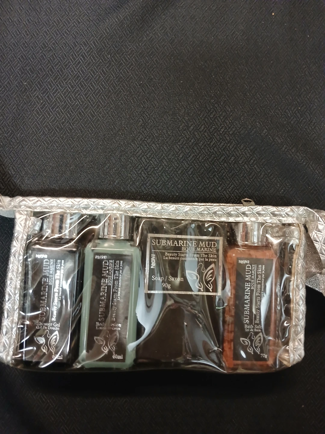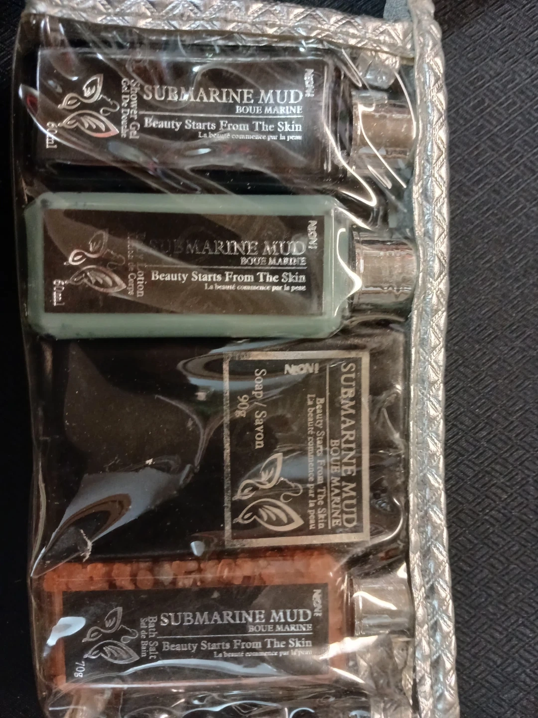 This NIONI Submarine Mud MARINE beauty set includes shower gel, body lotion, soap, and bath salts. Perfect for travel or a little self-care at home