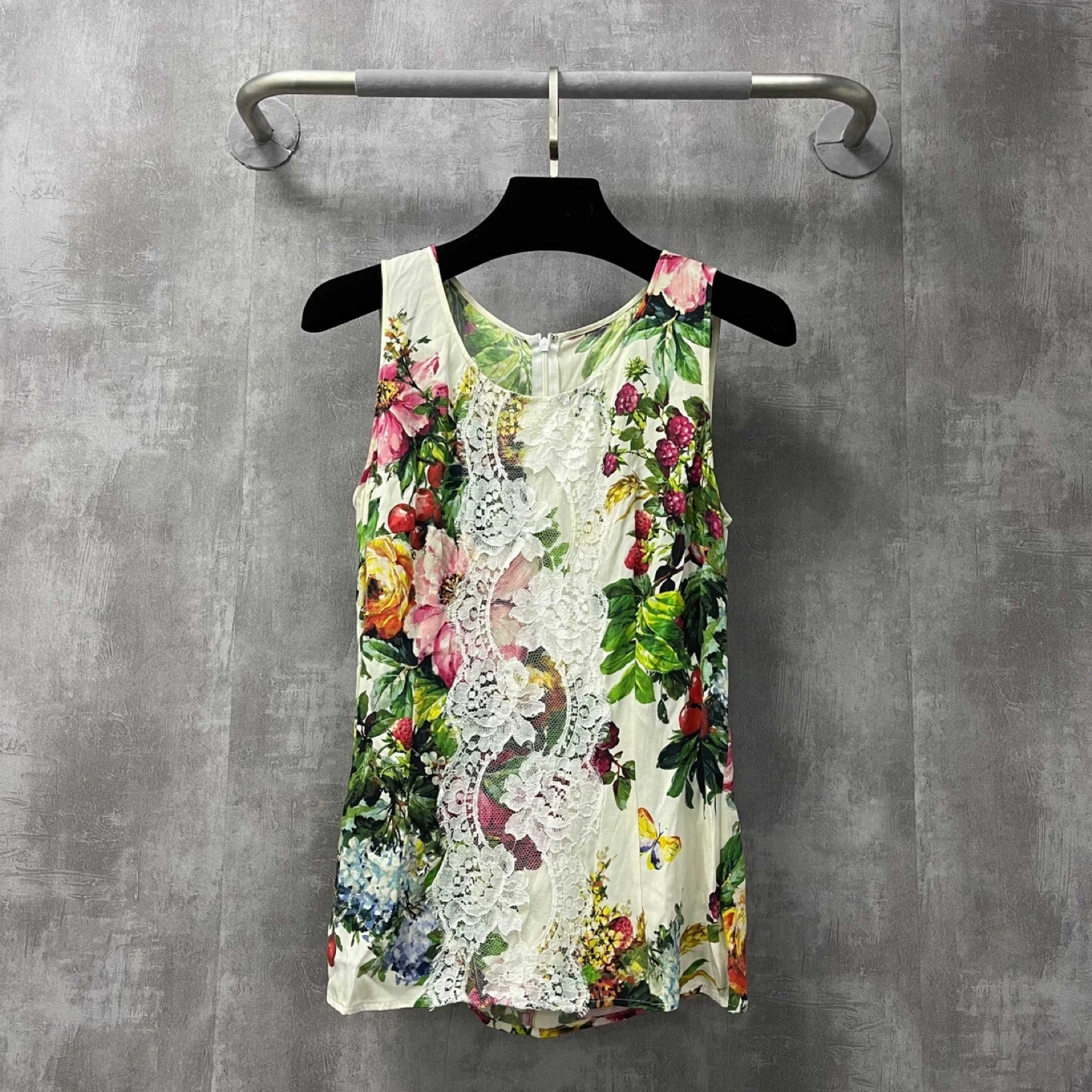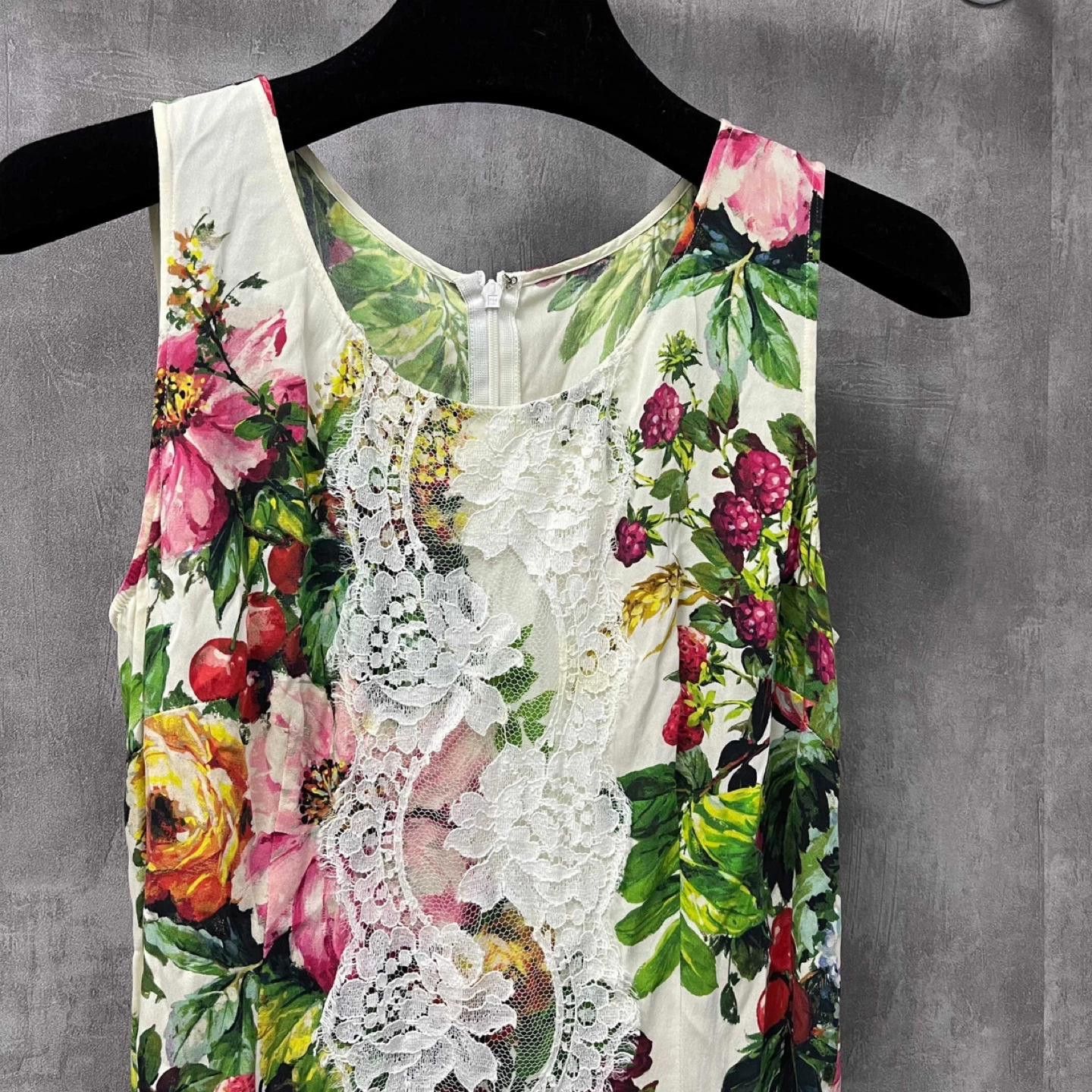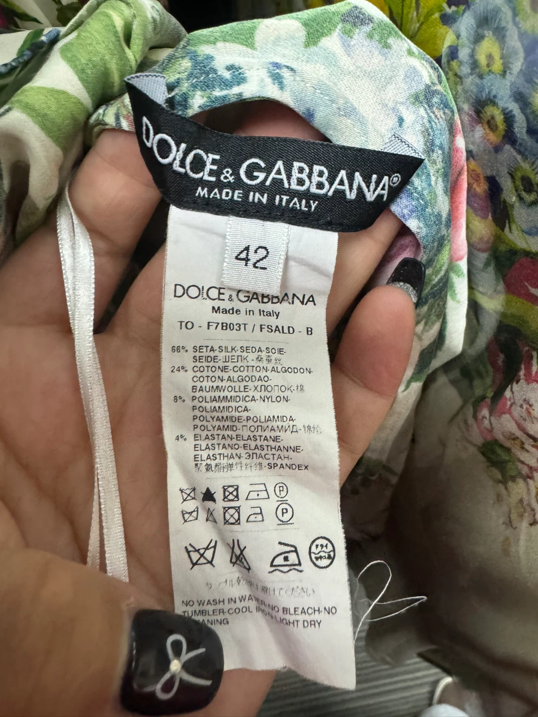 This is a Dolce & Gabbana top with a beautiful floral print and lace detailing! It's a size 42 and made in Italy.