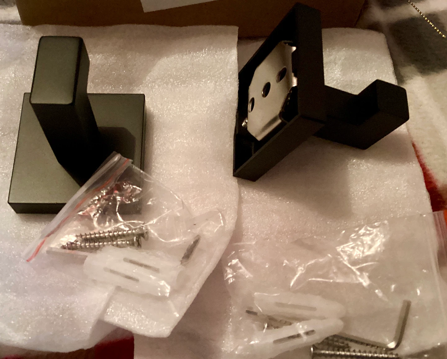 Selling wall-mounted hooks, perfect for adding a touch of modern style to your home! It comes with all the necessary mounting hardware, including screws and wall anchors, so it's ready to install. The hooks are a sleek black matte colour and new condition. It also comes with the box!