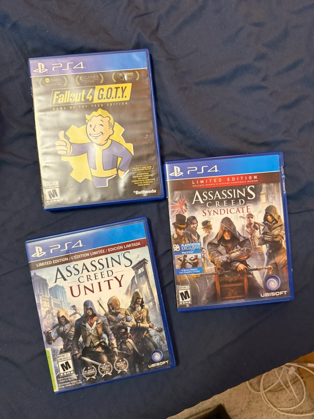 Selling my PS4 console great condition. Comes with a controller and three games: Fallout 4 Game of the Year Edition, Assassin's Creed Syndicate Limited Edition, and Assassin's Creed Unity Limited Edition.