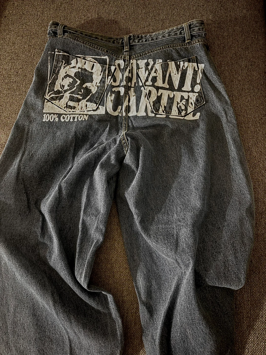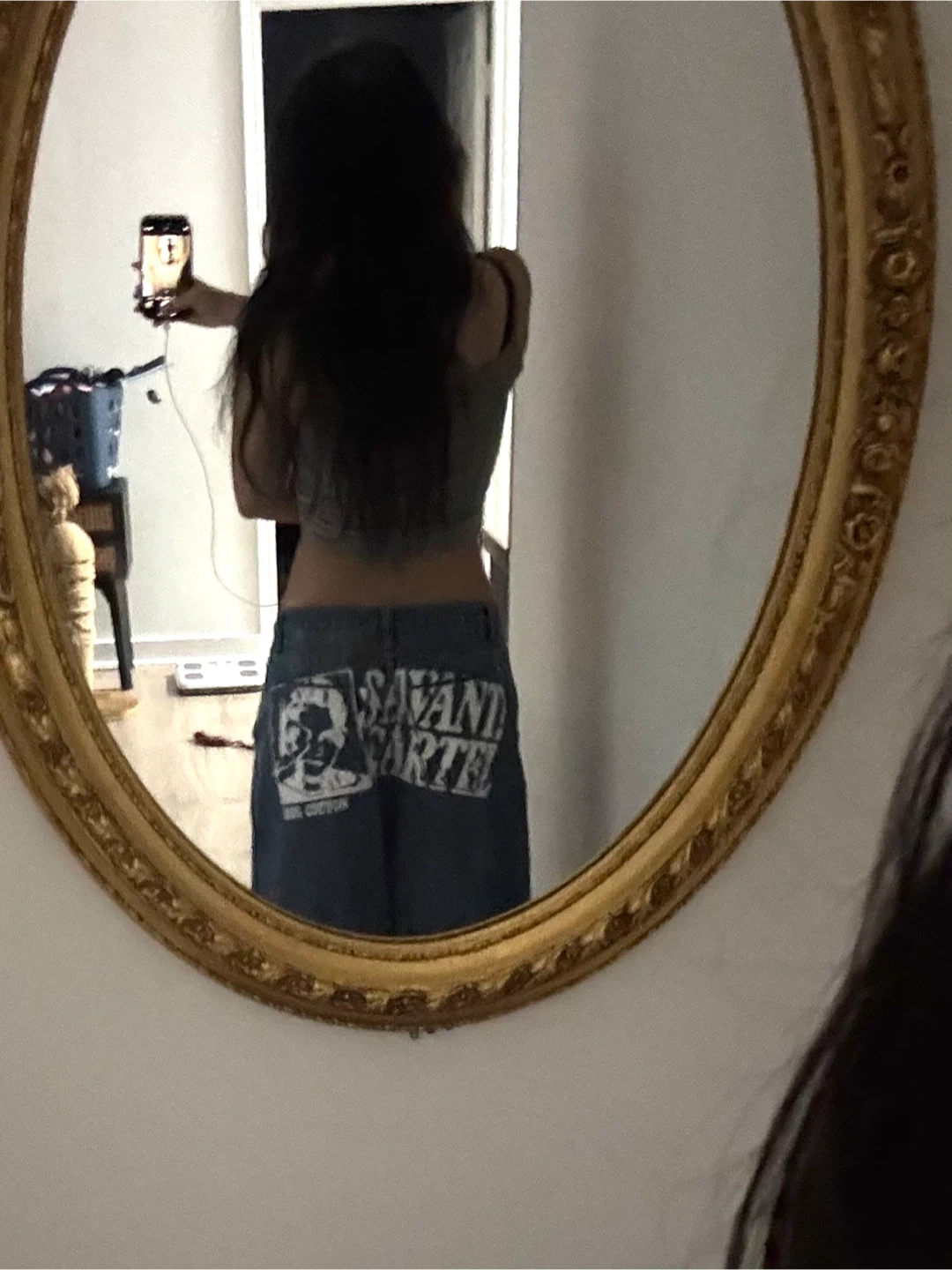 Selling a pair of jeans! These jeans feature a unique design on the back pockets. They're in great condition and ready for a new owner