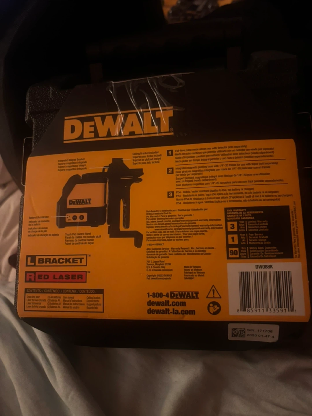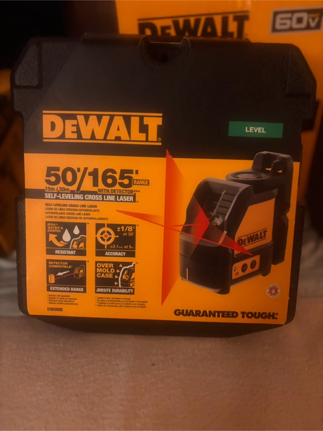 Selling a brand new DeWalt DW088K self-leveling cross line laser. It has a 50'/165' range and is water and debris resistant.