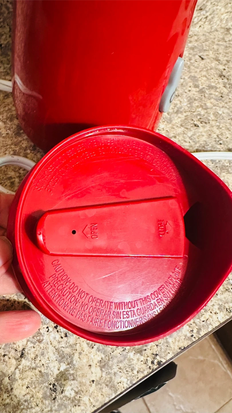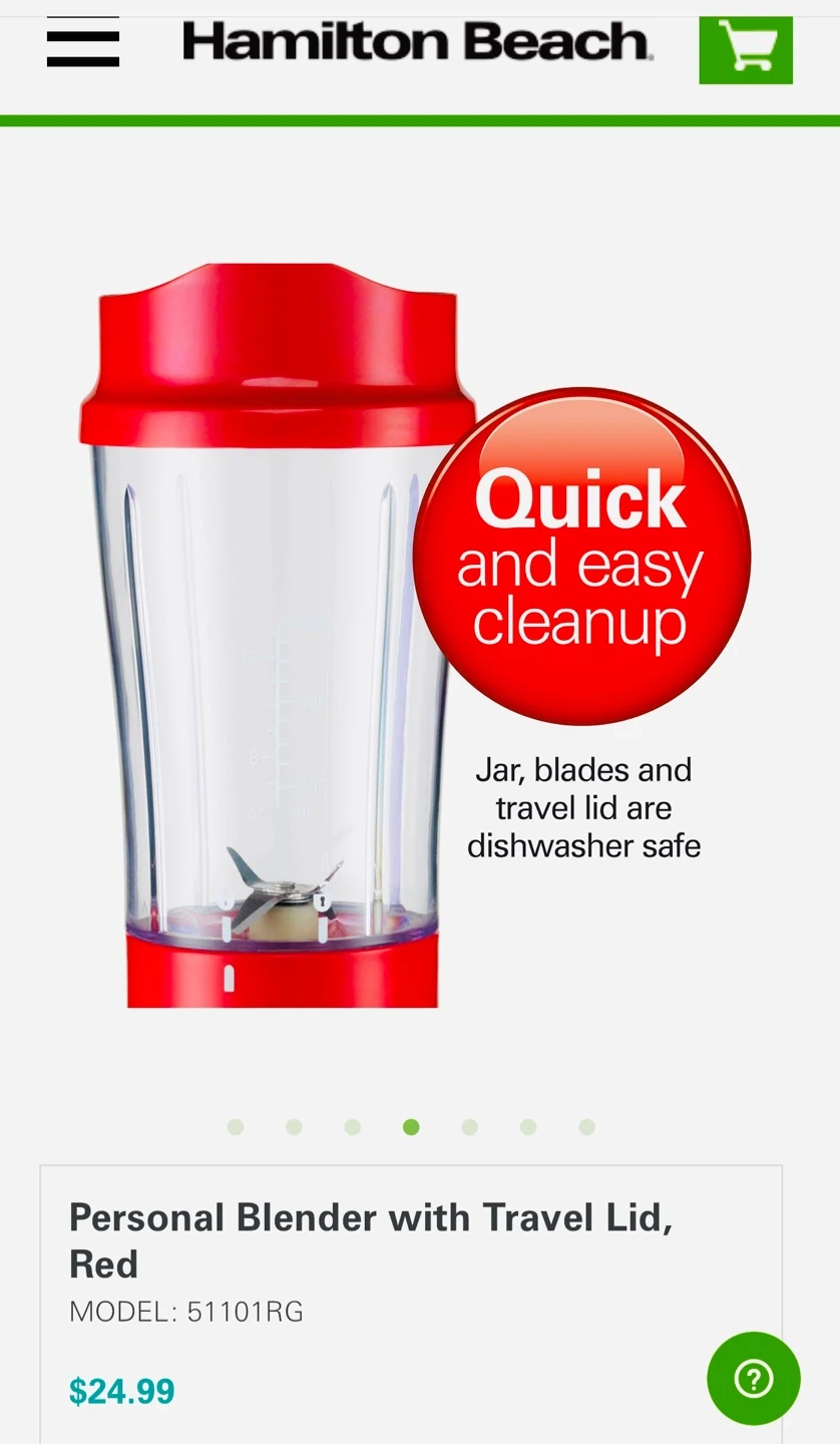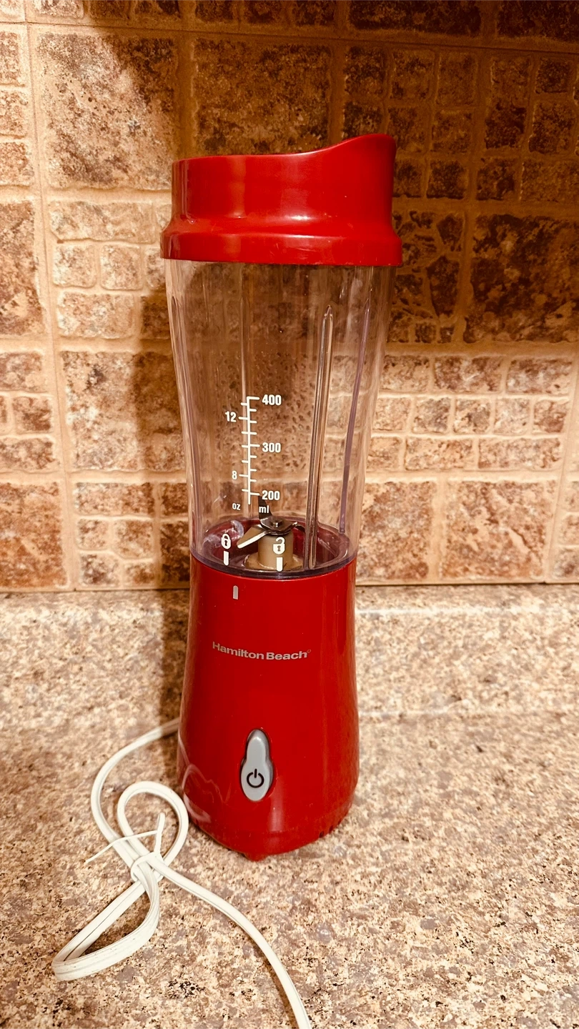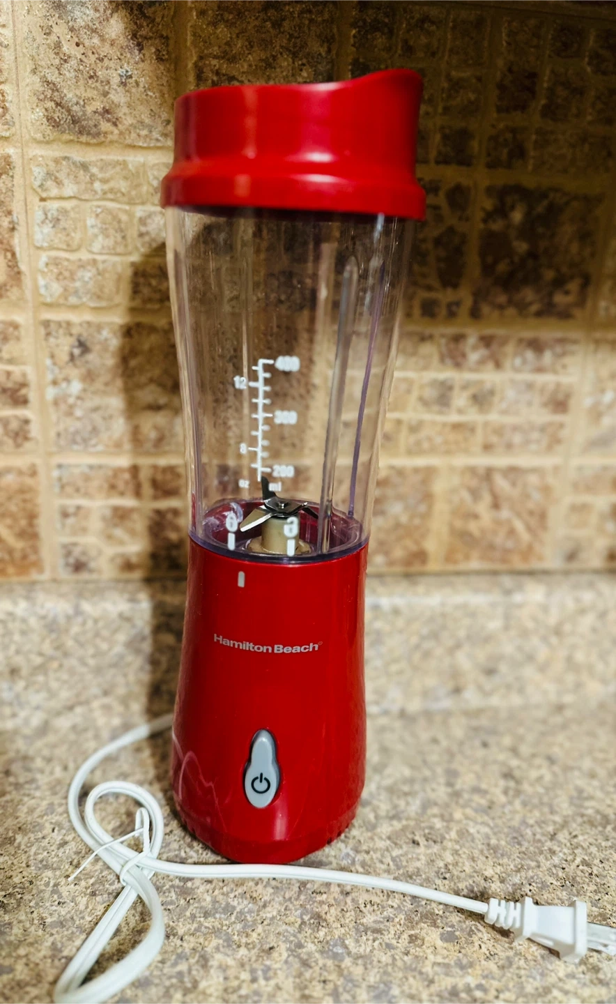 I'm selling a Hamilton Beach personal blender in red. It comes with a travel lid, making it perfect for on-the-go smoothies and shakes. The jar, blades, and travel lid are dishwasher safe for quick and easy cleanup. Originally bought for $24.99!
