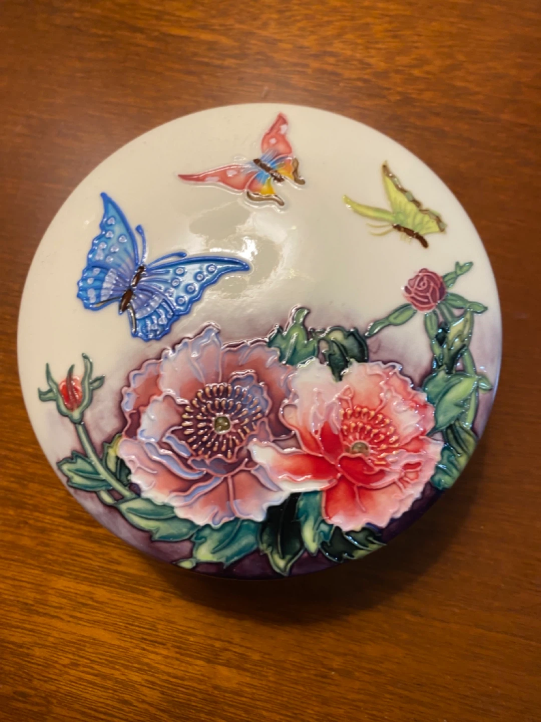 Here's a lovely Old Tupton Ware trinket box! It features a beautiful hand-painted floral and butterfly design on the lid. Perfect for storing small treasures or adding a touch of elegance to your space